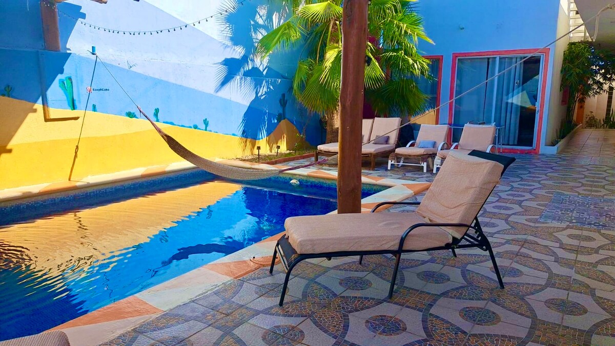 Económica estancia en Los Cabos, Cabo San Lucas. El estudio es para su uso exclusivo y cuenta con : -baño completo privado con secadora de cabello -cocineta con parrilla de inducción, cafetera, minifridge, microwave,platos, tazas, vasos. -barra para comer dentro del estudio. Alberca , jacuzzi, terraza, cocina exterior con grill compartidos con otros 6 estudios. Las mascotas son bienvenidas, siempre que las agregue en su reserva, como un huesped extra para que puedan acceder .
