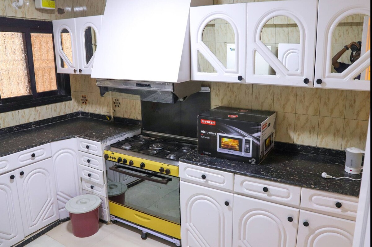 Odsjednite na samo 1,4 milje (7 minuta) od aerodroma u Kairu, sa prelijepim pogledom na aerodrom i baštu ispred kuće, bez buke aviona. Dostupno je 🚖 besplatno dovoženje sa aerodroma i pristupačan prevoz 🔑 Samostalna prijava pomoću privatnog PIN-A ⚡ Brza Wi-Fi mreža za posao ili strimovanje 🚗 Uber vam je non-stop na pragu 🥘 Samo nekoliko koraka (1–3 minute hoda) do restorana, kafića, supermarketa