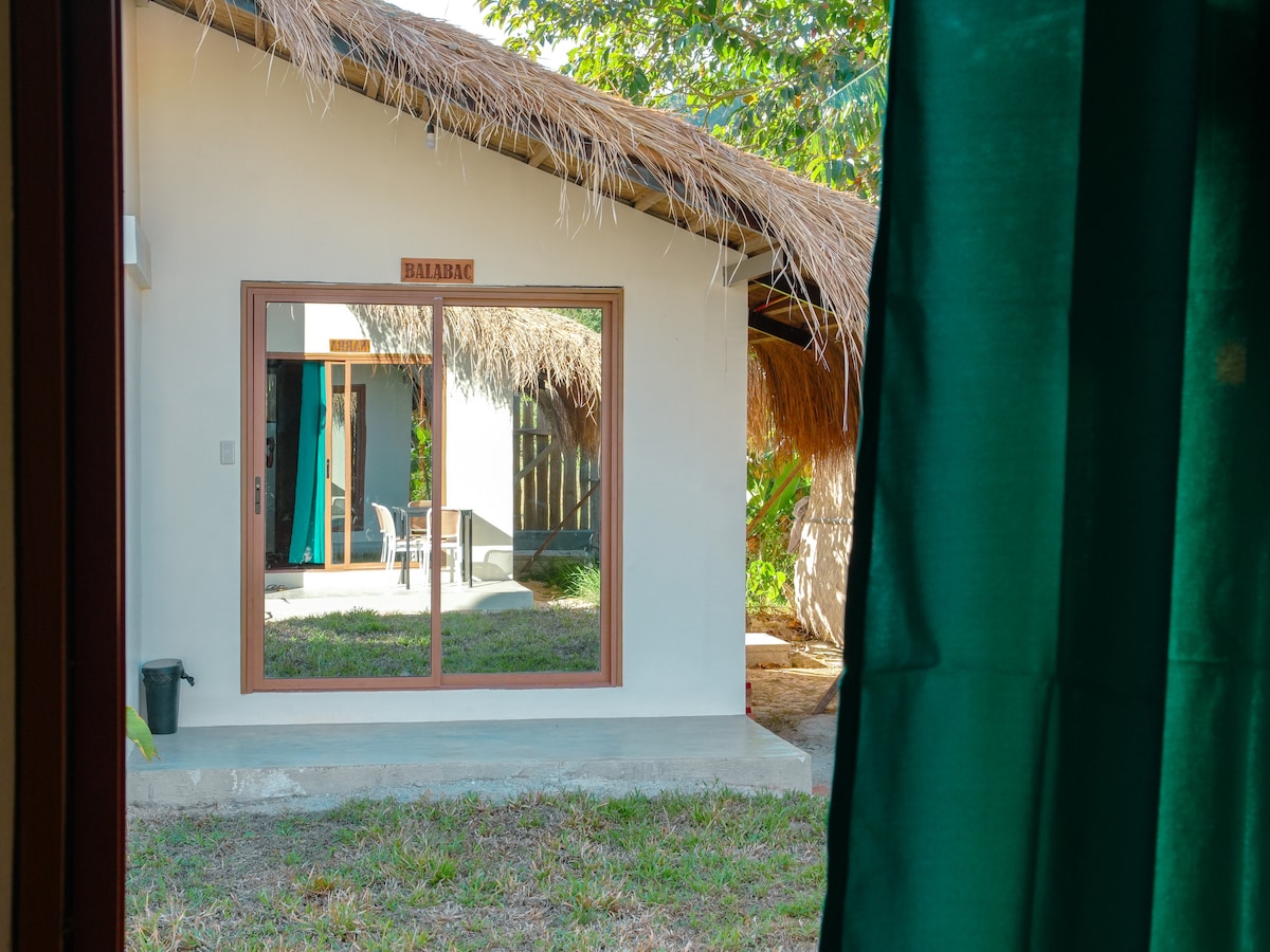 We are five minutes away from Lio Beach and El Nido airport, 15 minutes from town. We offer a calm and private setting away from busy areas. The neighborhood is still developing, with fewer nearby structures, unpaved roads, and more open green space. Our 'balay' has two duplexes with four identical rooms, each with open-air bath and all other amenities for your utmost comfort. We are close to nature; imagine bird noises & cricket sounds at night. Perfect for couples or small families!