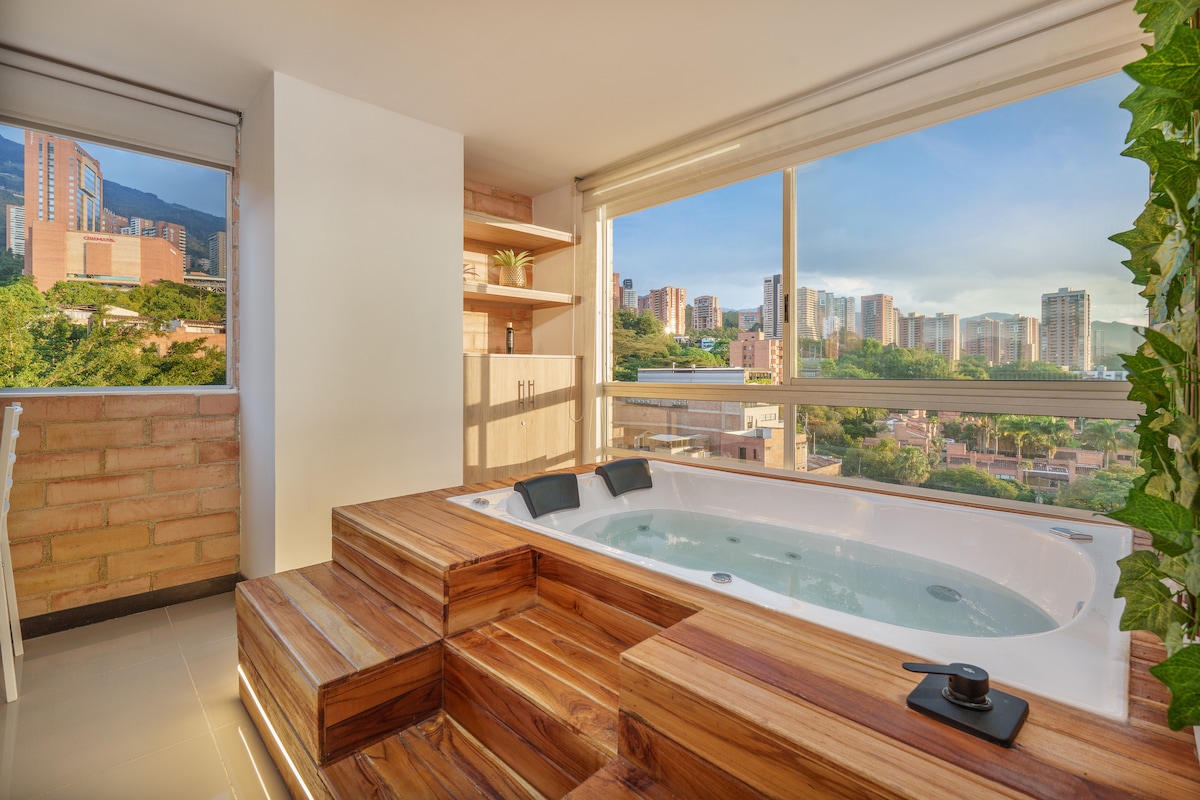 Doživite Medeljin iz ovog elegantnog apartmana na 16. spratu u El Poblado sa privatnim đakuzijem, balkonom, klima-uređajem u obe spavaće sobe, brzim Wi-Fi mrežom, namenskim radnim prostorom i 3 HD pametna TV-a sa Netflix-om. Kuvajte u potpuno opremljenoj kuhinji, koristite mašinu za pranje/sušenje veša i čajnu/kafe stanicu i uživajte u spa centru, teretani, parnoj sobi, bazenu, restoranu i kafeteriji. Kratka vožnja do tržnih centara Ljeras i Provenza – vrhunskog utočišta za luksuz, udobnost, stil i nezaboravan gradski život.
