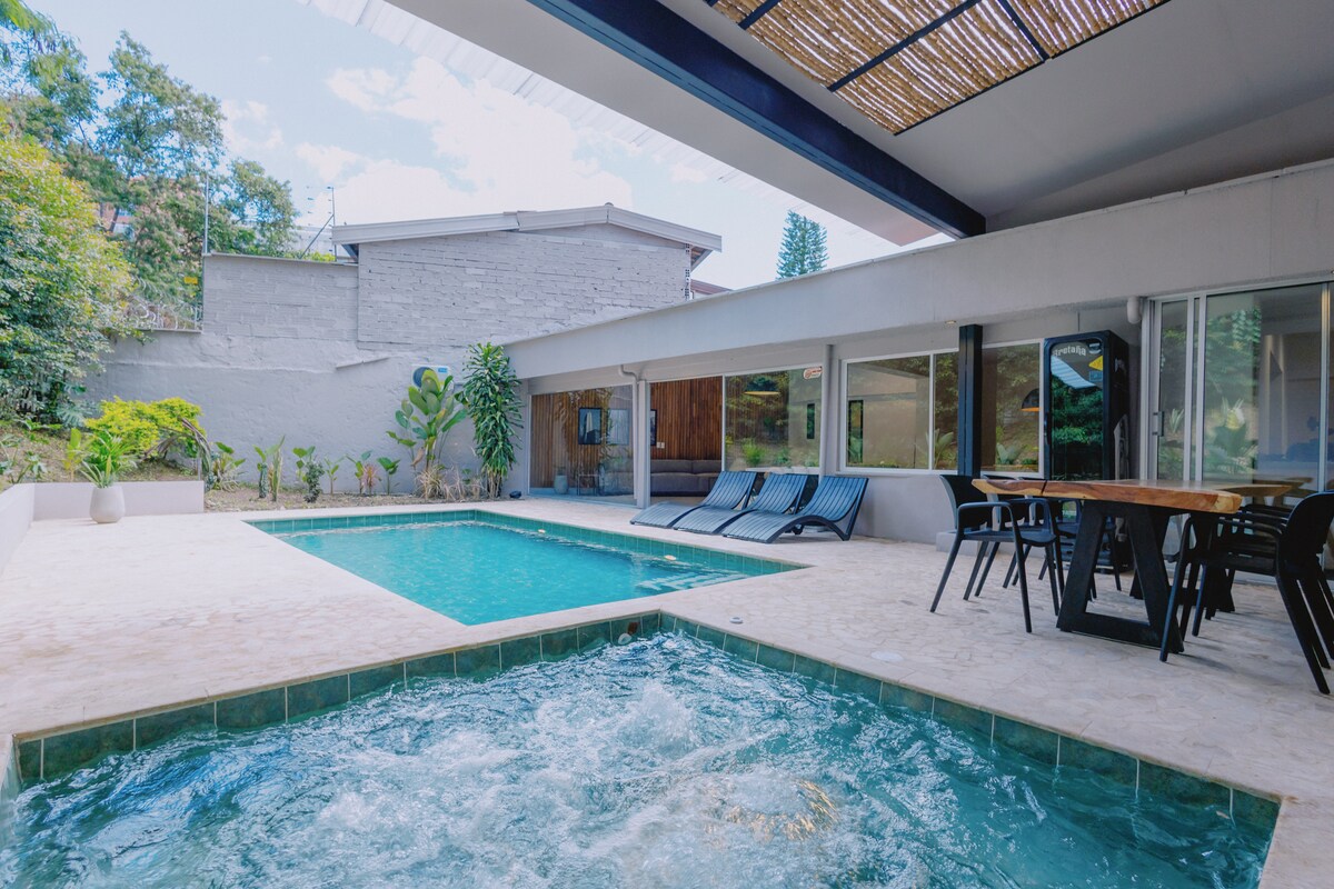 Uživajte u jedinstvenom doživljaju u ovoj kući u boemskom stilu, sa privatnim đakuzijem, tropskom vegetacijom i ručno izrađenim detaljima. Samo 3 minuta hoda od Parka Lleras i Provenca, ali dovoljno daleko da se odmorite u potpunom miru. ✨ 3 sobe sa privatnim kupatilom i klima-uređajem Opremljena ✨ kuhinja + rustikalna trpezarija Otvorena dnevna✨ soba + TV + balkon od 58inča Grijani ✨ đakuzi + prirodno svjetlo ✨ Idealno za grupe, odmore i VIP doživljaje u Medelinu.