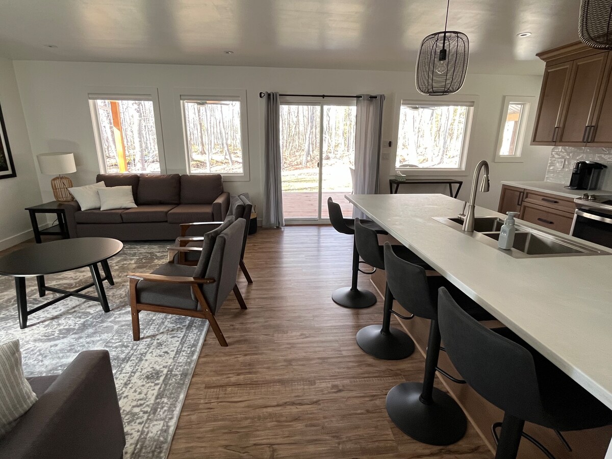 Peaceful forested land with a bluff across it - Year-round! New spacious and quality furnished guesthouse for your comfort and enjoyment. 2 bedroom, open concept with propane fireplace, stand-alone Jacuzzi room (standard size tub), and separate toilet room. Infrared 2-person sauna! A well equipped kitchen, Starlink internet, 60" 4K 'smart' TV, Bell HD pvr, sound system, and a leather couch. A large equipped deck, small balcony, and fire pit area with sitting logs. Private..