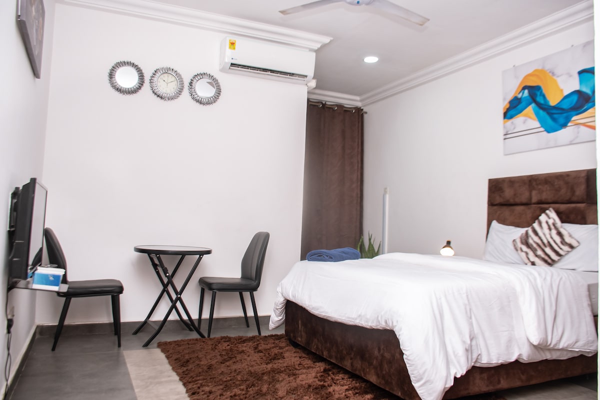 Neka sve bude jednostavno u ovom mirnom smještaju koji se nalazi u centru grada, na putu Spintex. Vrlo udoban prostor, oko 15 minuta od aerodroma, 10 minuta od Teme i u neposrednoj blizini tržnih centara i centara za noćni život. Postoji generator u pripravnosti u slučaju nestanka struje. Tu je i besplatan Netflix. Gosti takođe imaju pristup bilijarskom stolu za zabavu. Postoji osoba zadužena za čišćenje, a smještaj ima non-stop bezbjednost.