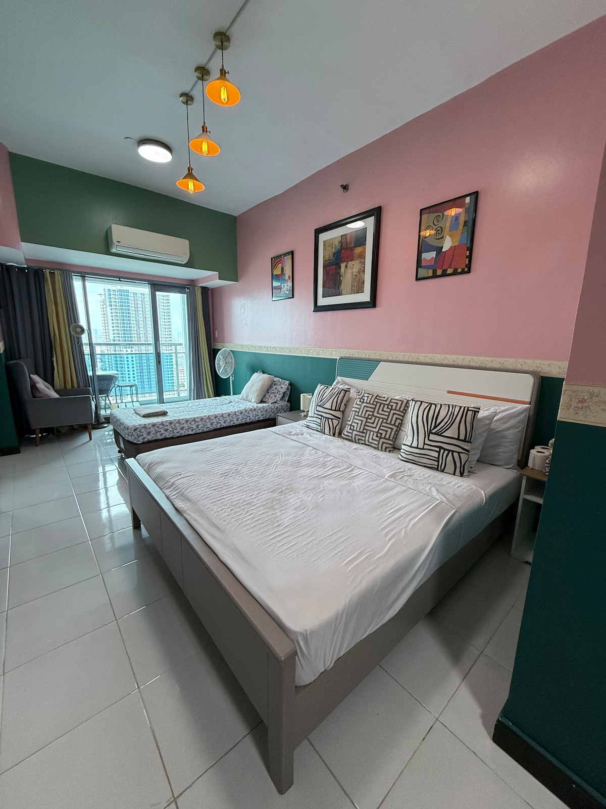 Moderan i prostran 1BR sa balkonom i bazenom samo nekoliko kilometara od aerodroma i na pješačkoj udaljenosti od brojnih atrakcija u području zaliva Manila. Dobro opremljena kuhinja, dnevna soba obasjana suncem, udoban krevet, Wi-Fi, Netflix, klima-uređaj i TV u dnevnom boravku i spavaćoj sobi. Savršen smještaj za parove, male porodice ili poslovne putnike. Prostor za igru sa saunom i djecom - besplatno za korišćenje Bazen - besplatan za najviše tri gosta; P200 za svakog dodatnog gosta.