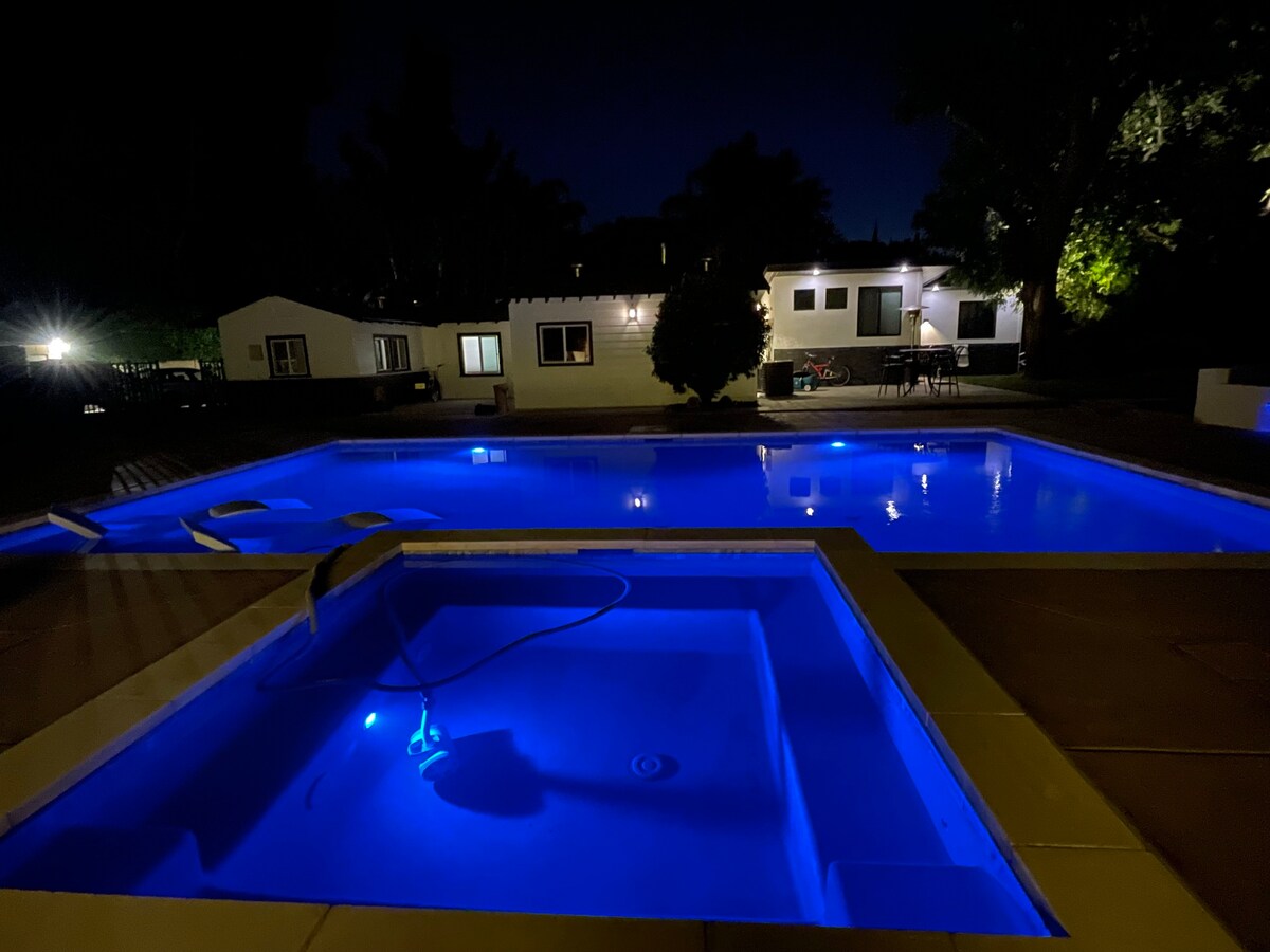 ZA PORODICE, Los Anđeles (BESPLATNI punjači za električna vozila) Manje od 25 minuta od Malibua, centra grada, Holivuda, Venisa, Pasadine, Juniversal Sitija, Beverli Hilsa, Santa Monike. Ovaj dom je nedavno opremljen i potpuno preuređen. Grejani bazen sa slanom vodom, fitnes oprema, kompletna kuhinja, roštilj, veliki televizori u zatvorenom i na otvorenom pored bazena. Radni sto za učenje. Đakuzi, kablovska, Wi-Fi, kancelarijski radni prostor, privatni parking, stolovi za ping-pong, igra „corn hole“, plutajući kreveti za bazen i penjalica.