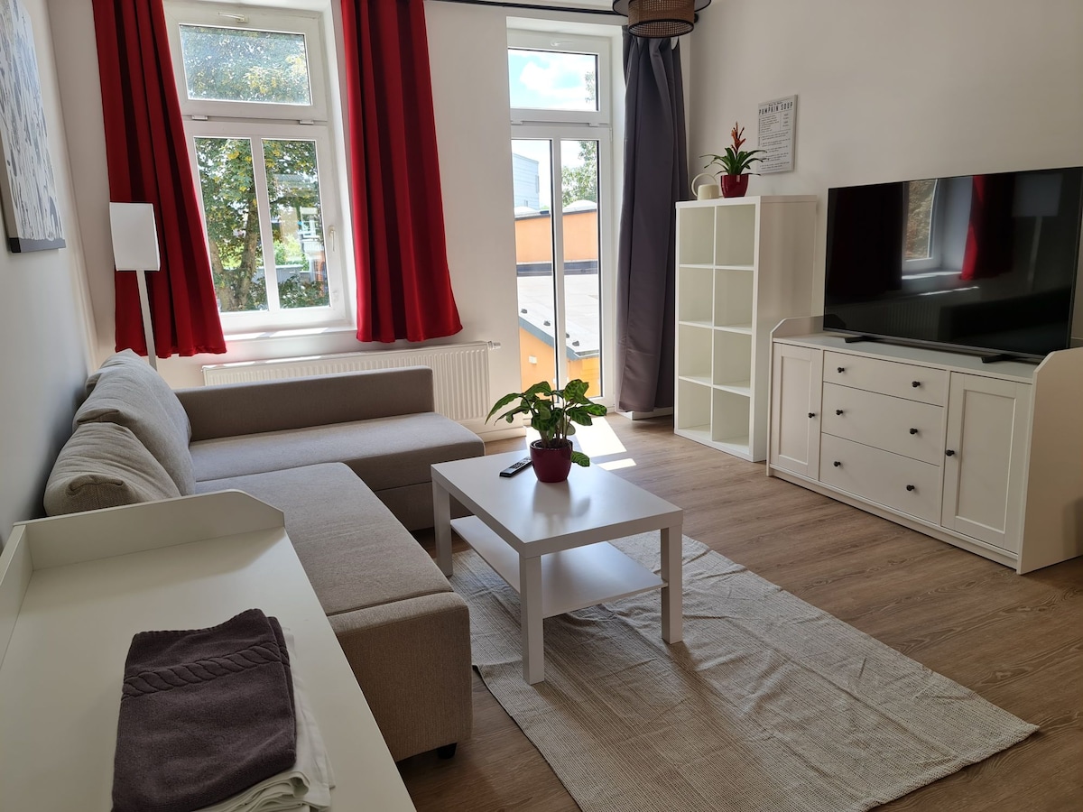 U našoj prelepoj vili Gründerzeit, rezervisali smo zaseban prostran stan za naše goste. Mirno i još uvek blizu centra. Dostupan je brzi Wi-Fi Pored toga, imate privatnu krovnu terasu i možete da koristite našu baštu u skladu sa ličnim dogovorom. Parking je dostupan ispred kuće. Istorijska kuća vas vodi u vrijeme opuštanja i usporava vašu pauzu!