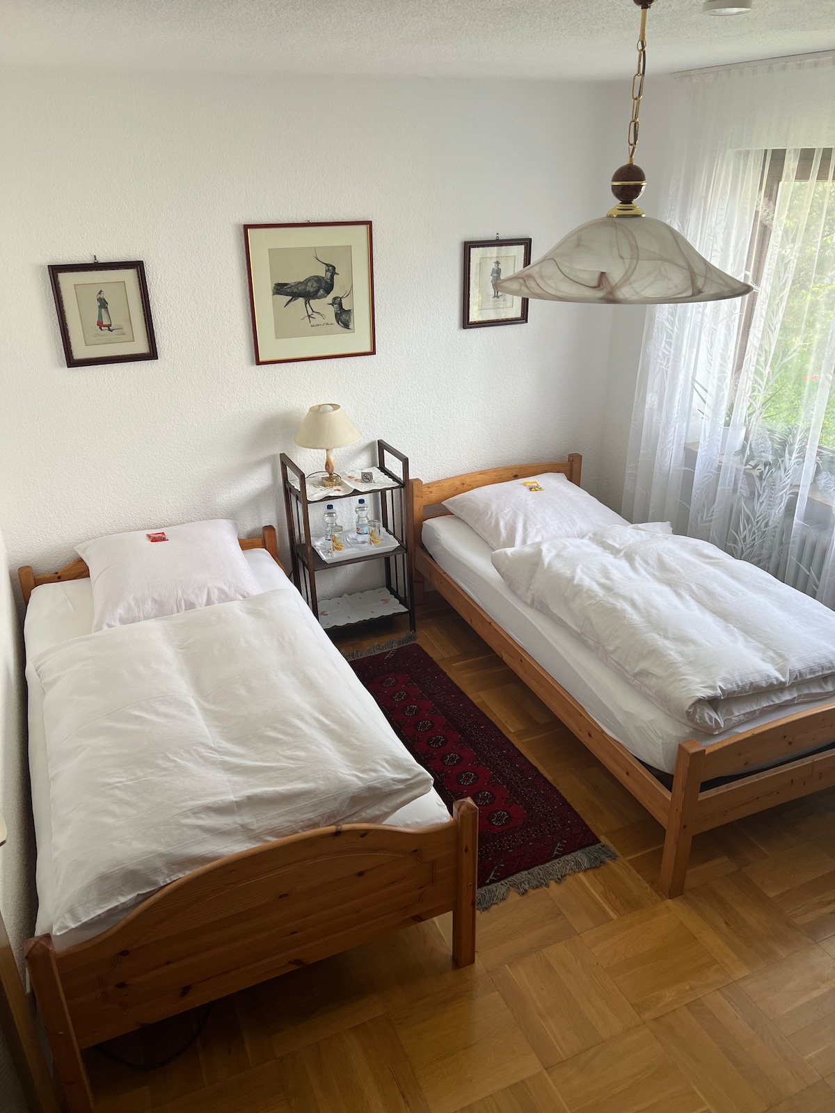 Dachgeschoßzimmer mit eigenem Bad. Wasserkocher, Toaster und Senseo Kaffeemaschine, Geschirr für 2 Personen vorhanden. Fahrräder können ausgeliehen werden. Bushaltestellen, Bäcker, Metzger in unmittelbarer Nähe. 10min mit dem Bus zum Zentrum. S-Bahn und Autobahn schnell erreichbar.