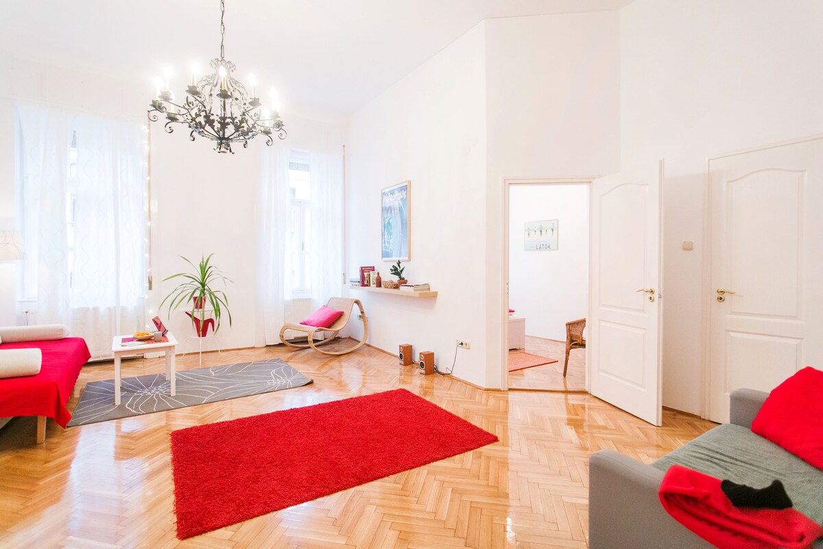 Smeštaj obuhvata jednu spavaću sobu sa bračnim krevetom (širine 150-179 cm) i veoma odvojenu dnevnu sobu sa otvorenom kuhinjom i trpezarijskim stolom. Kupatilo je veliko i mazi. Stan je pun svjetla, prozračan i ima odličnu atmosferu. Imate brzi WI-FI u stanu, kao i lan vezu. Ceo stan je dostupan za upotrebu, uključujući Nespreso aparat za kafu, rernu, frižider i mikro. Našim gostima nudimo da uživaju u našim organskim ručno izrađenim sapunima. Imate brzi WI-FI u stanu, kao i lan vezu. Ceo stan je dostupan za upotrebu, uključujući Nespreso aparat za kafu, rernu, frižider i mikro. Stan se nalazi u petom okrugu, u srcu centra Budimpešte. Komšiluk je živahan, a restorani, kafići i ruševine su svuda unaokolo. Ulica je vrlo blizu poznate Dohany sinagoge i trgovačke ulice Vaci. Kretanje ne može biti jednostavnije iz ovog stana. Možete da prošetate do poznatog centra grada ili da koristite neki od odličnih javnog prevoza; autobus, metro ili tramvaj. Stan je udaljen 50-200 metara od autobuske, tramvajske i metro stanice. Stan se nalazi na drugom spratu istorijske zgrade koju je dizajnirao isti poznati arhitekta opere. Stan je moderan, ali zgrada nije renovirana i nema LIFT, slično kao mnoge zgrade u centru Budimpešte koje spajaju prošlost i sadašnjost, stare i nove.