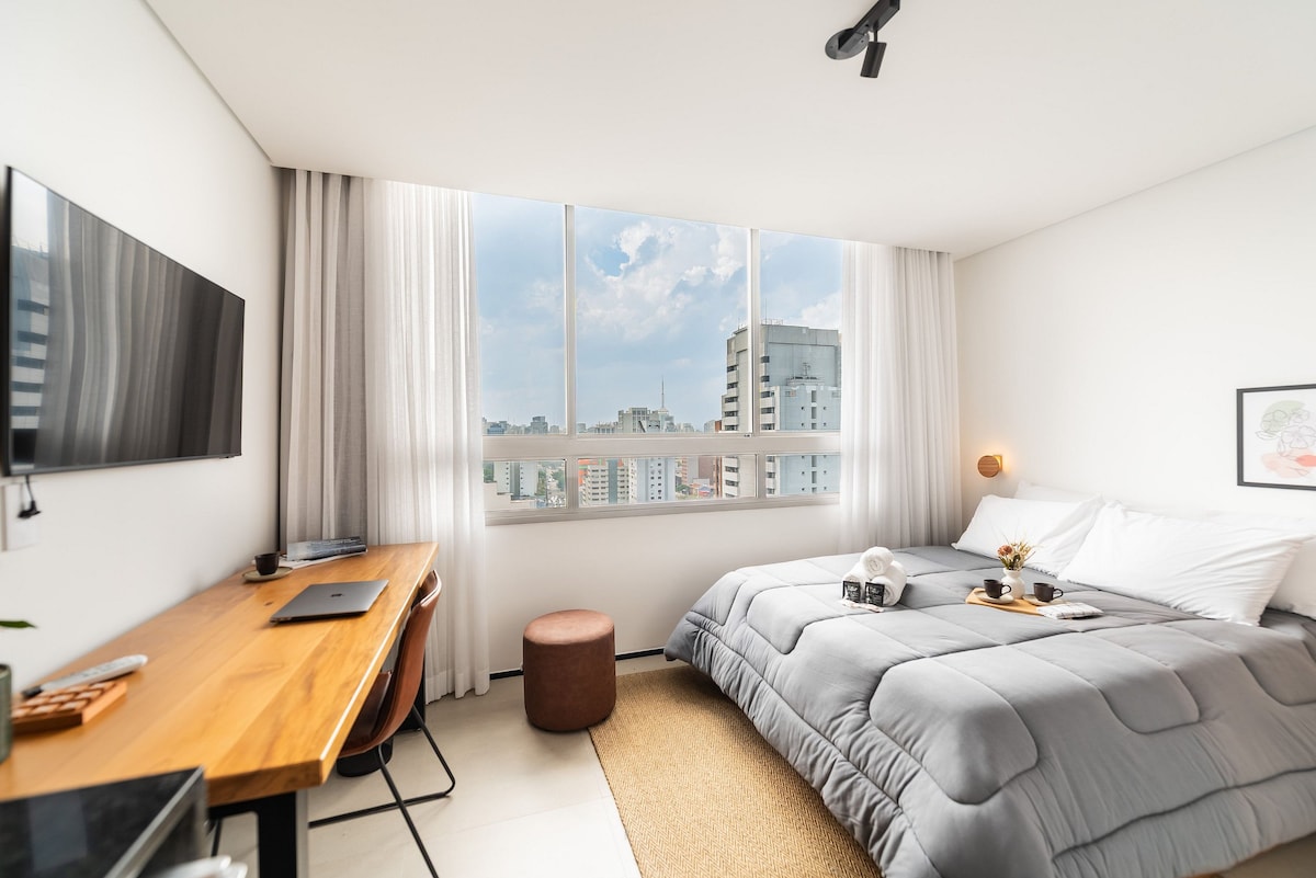 Moderan, funkcionalan i ukusan studio u svakom detalju. Ima bračni krevet i krevet za jednu osobu. Kuhinja opremljena pločom za kuvanje, mini barom, podrumom, mikrotalasnom rernom, aparatom za kafu i priborom. Prostor za rad i obrok, klima-uređaj, Smart TV, brzi Wi-Fi, kupatilo sa kutijom. Zgrada hotelskog lica, sa recepcijom koja radi non-stop, fitnes centrom, praonicom veša, coliving-om, coworking-om, bilijarskim stolom i bazenom. Samo 200 metara od stanice Vila Mariana, sa pijacom u zgradi i u istoj ulici. Mnogo prodavnica i restorana u blizini