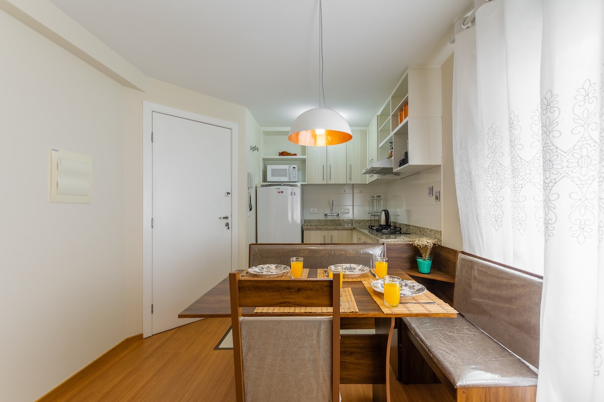 Moderna garsonjera, u centru grada – idealna za one koji traže udobnost, praktičnost i odličnu lokaciju u Kurtibi. Klimatizovano okruženje, opremljena kuhinja i pametni TV – savršeno za odmor ili rad. 🛏️ Može udobno da ugosti do 4 osobe, kvalitetna posteljina. • Grijani bazen • Teretana • Sauna • Terasa • Veš (plaća se) 🚗 Parking je dostupan u zgradi, 35 R$ po noćenju Plaćanje putem PIX-a domaćinu.