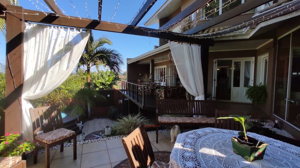 Uma charmosa vila em estilo farmhouse (casas de campo) em meio a uma natureza exuberante. Aqui você encontra conforto, paz e tranquilidade para a sua família, além de boas opções turísticas e gastronômicas bem pertinho de você. Contamos com um amplo jardim gramado de uso comum, com um lago ornamental, uma piscina, bicicletas, pergolado com bancos, celeiro, fogo de chão e um lindo balanço para fotos! Uma rede e uma espreguiçadeira na varanda frontal são um convite para relaxar no pôr do sol.
