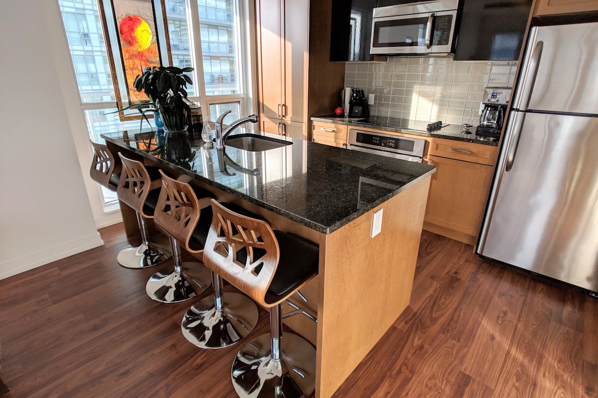 Luksuzni novouređeni dom daleko od doma u centru ulice Front 300 s balkonom s pogledom na CN toranj. 2 spavaće sobe 2 kupatila, udoban bračni krevet TV sa odijelom, TV sa bračnim krevetom i zavjesama za zamračivanje Uživajte u teretani, parnoj sobi, spoljnom bazenu sa pogledom na grad od 360 stepeni, hidromasažnoj kadi i roštilju. Na samo nekoliko koraka od CN tornja, Rodžers centra, akvarijuma, Kongresnog centra metroa, kratke šetnje do arene Skotiabank, jezera, Bel Lajtboksa, aerodroma Bili Bišop, stanice Union, okruga za zabavu i još mnogo toga