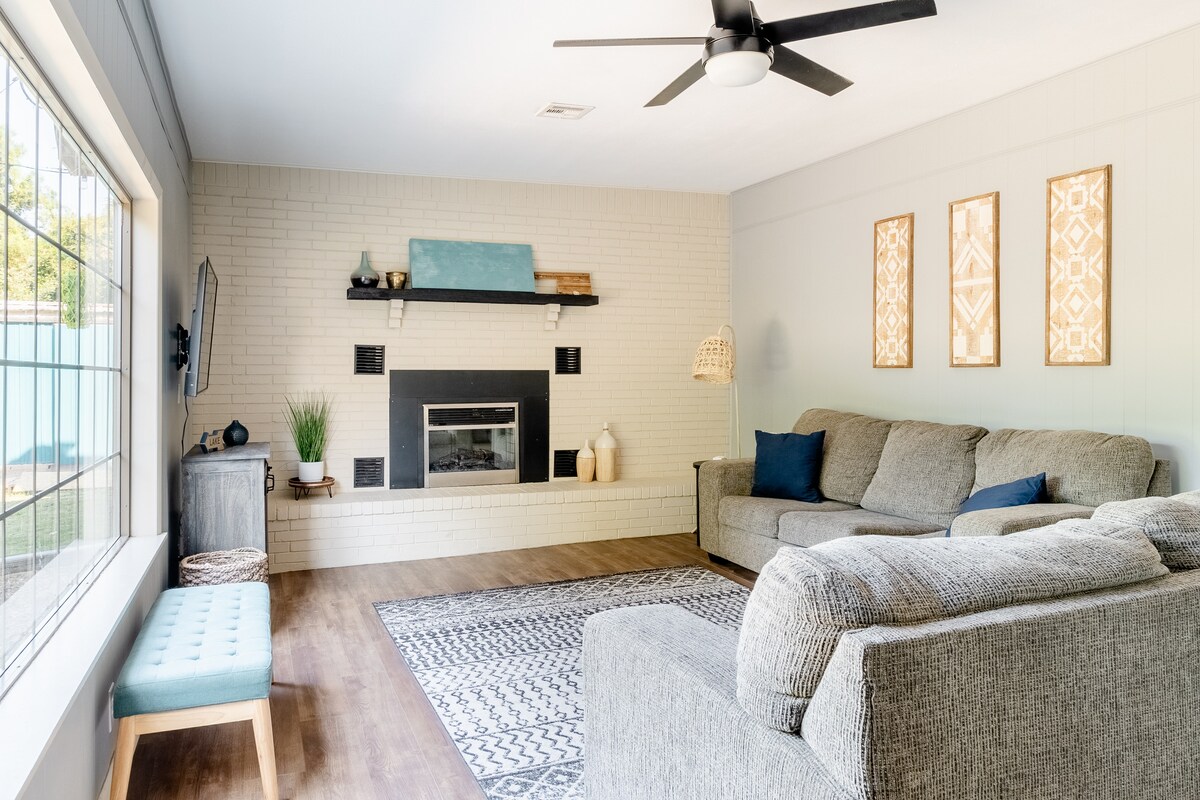 'Reel Life Fish Tales' is the perfect getaway for any group of outdoor enthusiasts. With a vibrant interior, spacious yard for boat parking, and prime location just a short walk from the water, this 2-bedroom, 2-bath house with 2 King Beds is the perfect fit. Enjoy boating and fishing on Eufaula Lake, check out local restaurants along Main Street, or take a stroll on the neighborhood's waterfront walking trail. Then, head back to cap off the evening by unwinding on the covered patio.