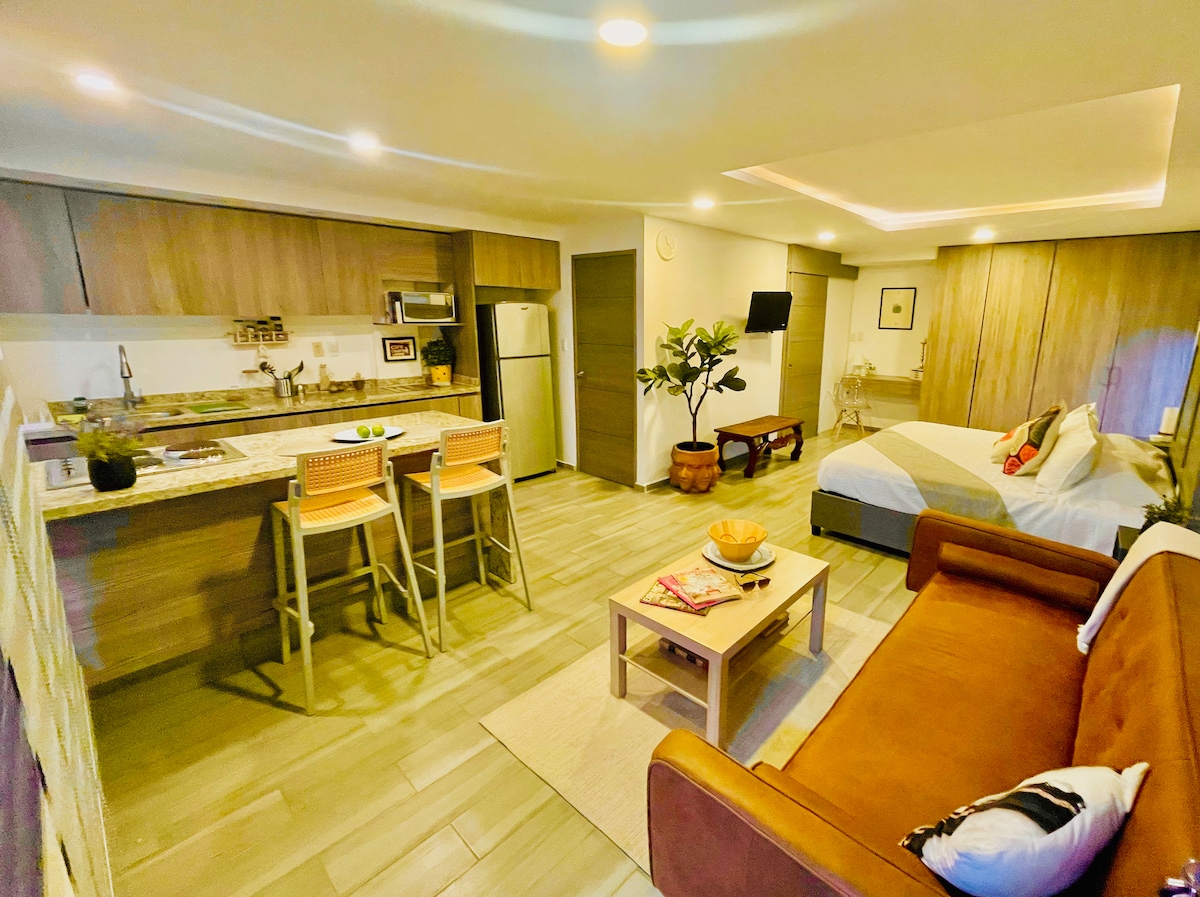 Enjoy an authentic experience in this 100% restored accommodation. We rescued its entire essence and improved it, located in the Americana neighborhood, known for its cultural and gastronomic offerings and its proximity to the embassy. Studio TzinTzunTzan features: Private terrace with outdoor furniture and dining area(work desk) King-size bed with high quality mattress Kitchenette with microwave, coffee maker, blender, and wine glasses 40-inch TV with Netflix and HBO Minibar refrigerator
