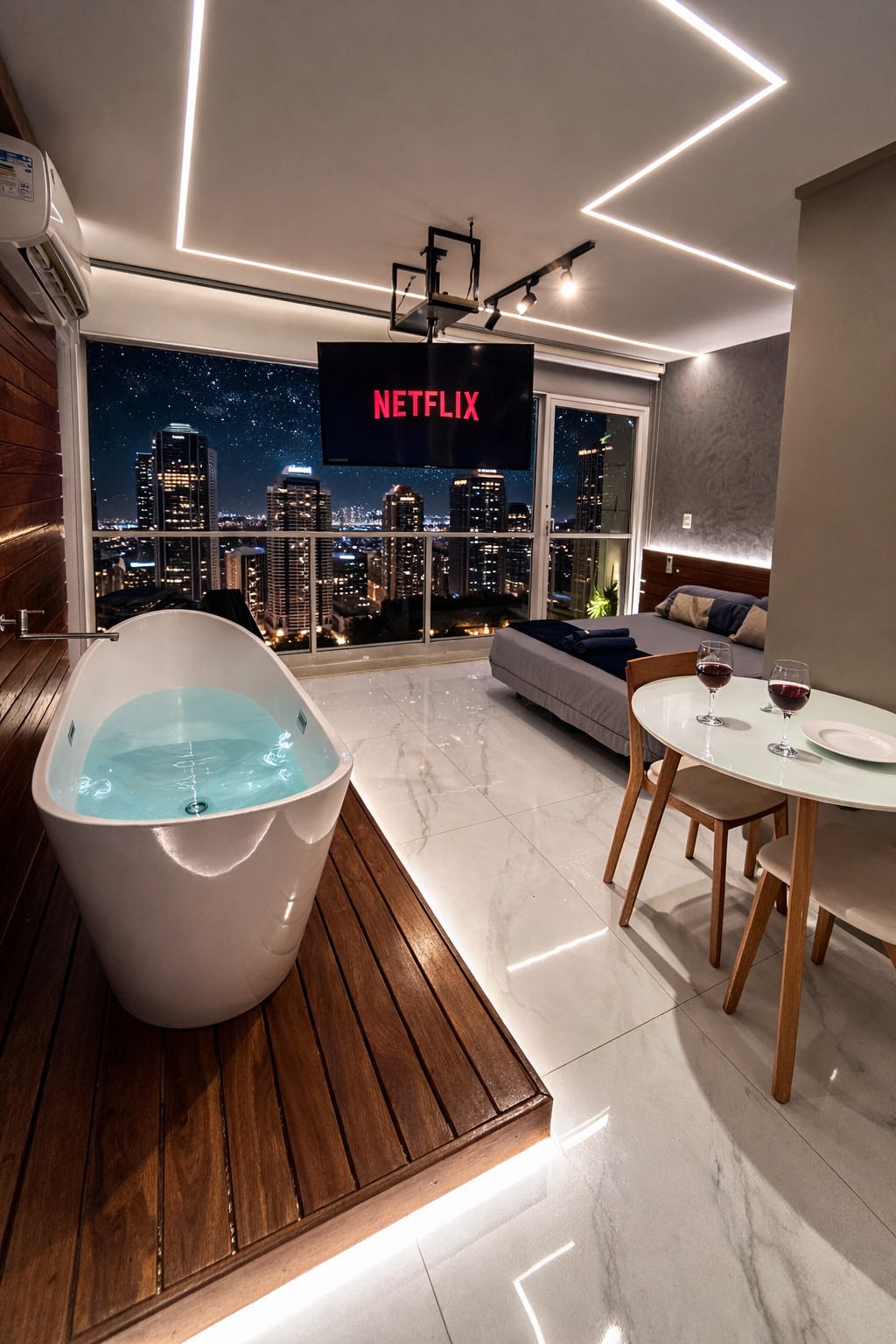 Estúdio espaçoso com muito design, arquitetura e a melhor vista de São Paulo. Loft completo! Com cama queen, closet, ar condicionado silencioso, cozinha completa, home office, WI-FI, TV 55” e uma belíssima banheira de imersão, de onde pode apreciar o seu drink preferido e curtir uma vista apaixonante. São Paulo toda estará há poucos minutos de você. Acesse o metrô andando apenas 200m. Reserve com tranquilidade! Proporcionaremos uma excelente hospedagem e uma ótima experiência!