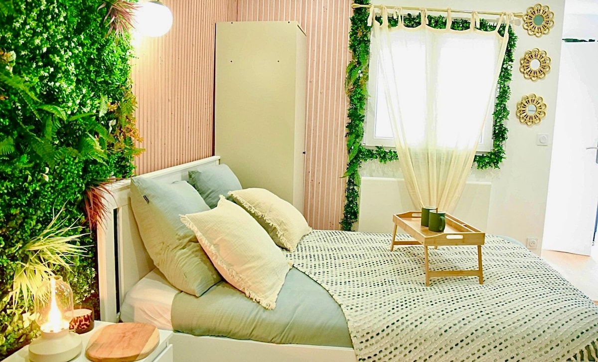 Vous avez envie de découvrir la région bordelaise en toute intimité ? Évadez-vous, en duo, dans cet appartement chic de 37 m². Il compte : - une belle loggia de 4 m² - un salon apaisant avec canapé-lit et TV (108 cm) - une chambre cocooning avec lit double cosy et TV (80 cm) - une cuisine équipée - un lave-linge et un sèche-linge - des équipements pour bébé Le logement a été rénové en 2023. Vous profitez d’une place de stationnement privée dans un parking couvert et sécurisé.