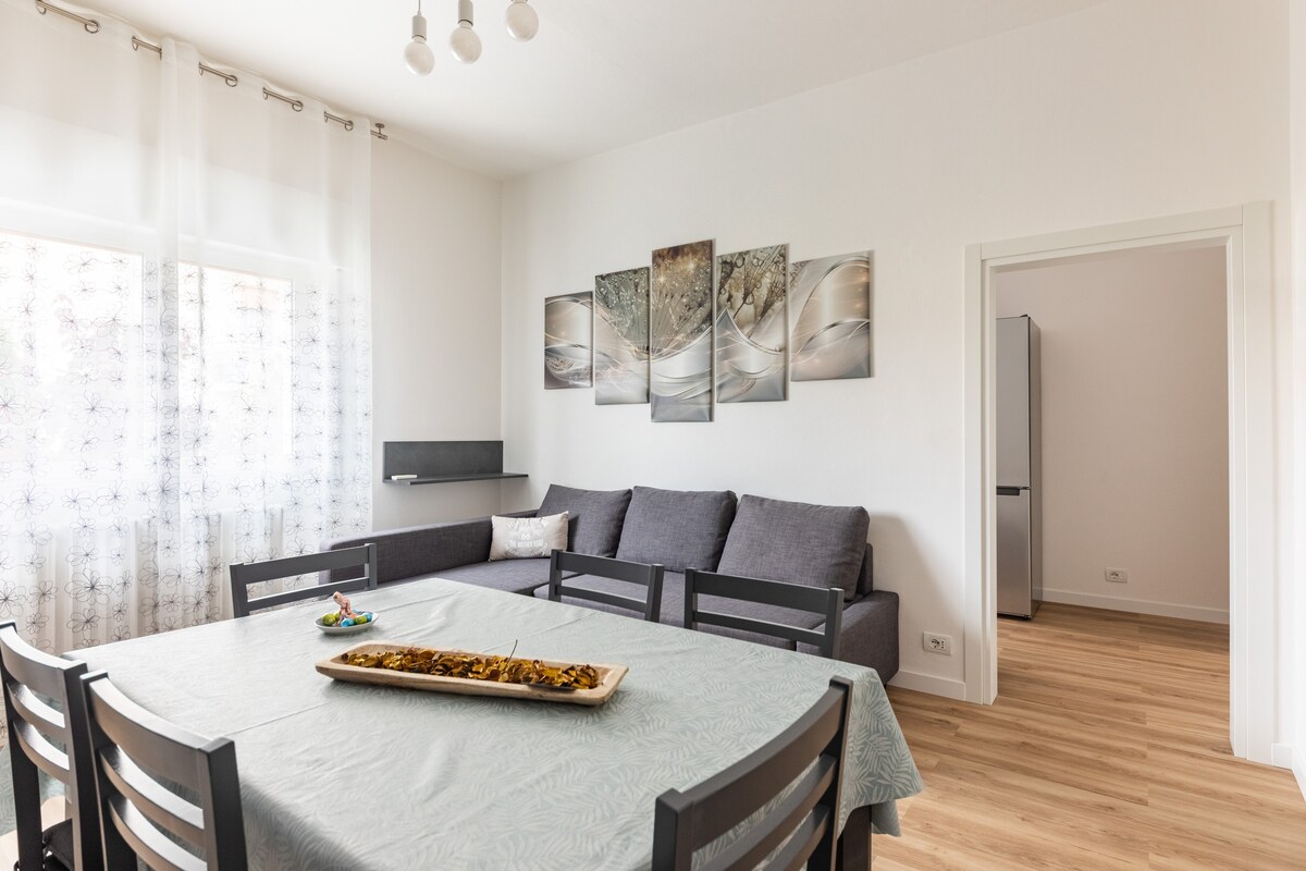 Elegantan apartman na drugom spratu, velika bašta, stolovi i stolice ispod trijema. Klimatizovane sobe za zdrav i udoban boravak. Udaljeni smo 1 km od centra, u mirnom području, sa besplatnim parkingom na otvorenom; 200 metara dalje, u Via Kovi, nalazi se autobuska stanica (linija 1, za Google liniju 51) koja vodi do centra i željezničke stanice, a odatle još jedna linija do tržnih centara „La Filanda” i „Le Maioliche”. Obezbjeđujemo bicikle za besplatno korišćenje, uz sigurnosni depozit od po 100 E.