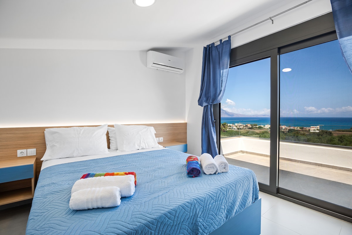 Stan sa predivnim pogledom na more. Ima direktan pristup terasi, sa panoramski pogled, ležaljke i sto sa stolicama. Stan ima 3 spavaće sobe, dnevnu sobu, potpuno opremljenu kuhinju i klima uređaje. Klima uređaj je i u dve spavaće sobe. Nalazi se u najvećem masliniku na Kritu, pešačka udaljenost do mora je samo 10 minuta! Sve sobe vode na balkon. Kupatilo je prostrano i u njemu je mašina za pranje veša.