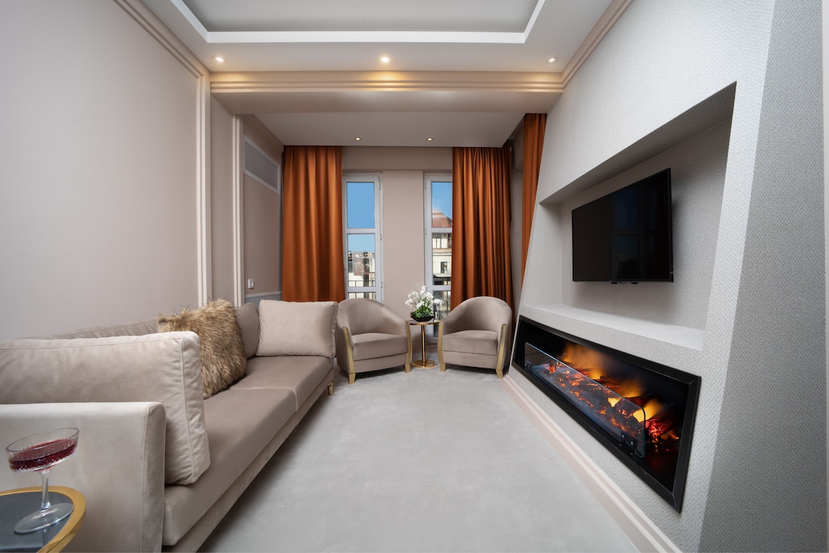 Ovaj privatni luksuzni stan je nedavno renoviran. Ima visok plafon (3,6 metara), prilično veliko kupatilo, spavaću sobu sa bračnim krevetom, saunu, đakuzi, zidni projektor (fiksiran!) i kamin. Veoma je pogodan za kratkoročne ili dugoročne boravke, parove i porodice, a nalazi se na 1. spratu našeg stana u sigurnoj ulici u ulici Beyoglu/Taksim. Do njega se može doći liftom ili stepenicama. Naša zgrada se nalazi pored ulice Istiklal i 10 minuta hoda od poznate luke Galata. Internet je 100 MBPS solidan fiber!