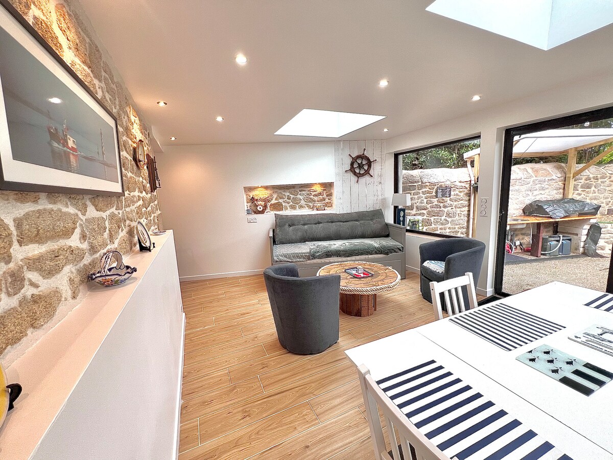 Prepustite se da vas zavede ovaj šarmantni stan od 50 m2, koji se nalazi između plaže i luke, za jedinstven odmor! Sa staklenim prozorom koji se otvara direktno na plažu , uživaćete u izuzetnom okruženju gdje se more i lučki život skladno stapaju. • Predivan pogled: Iz dnevne sobe posmatrajte zalazak sunca. Plima i oseka. Savršeno za par koji želi da bude u srcu sela. 150 metara od lučkih restorana i 50 metara od lokalne prodavnice.