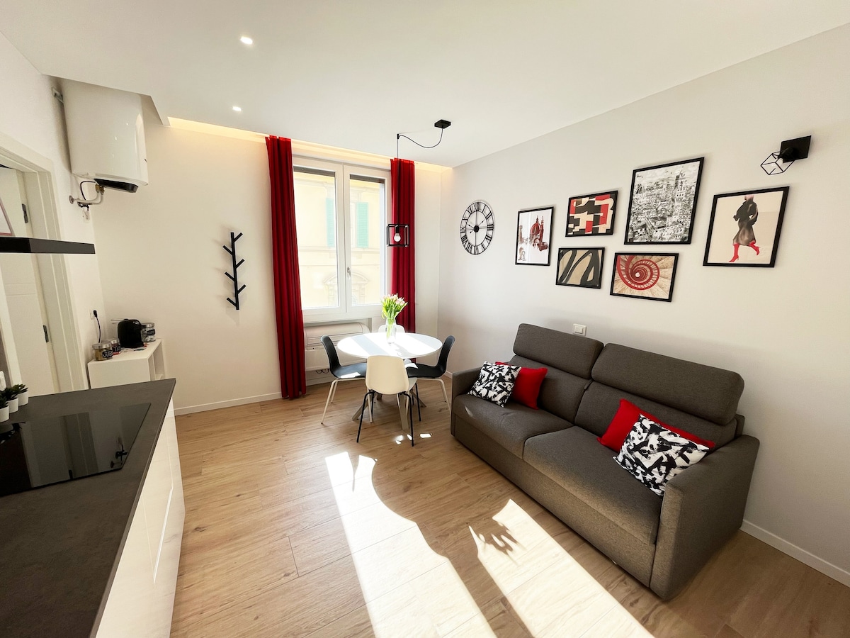 Luminoso e confortevole appartamento di 45 mq nel centro di Firenze, a soli 10 minuti a piedi dal Duomo e da 2 minuti dalla stazione ferroviaria di Firenze S.M.N. Secondo piano senza ascensore (attenzione non c'è ascensore, circa 44 gradini) di una caratteristica palazzina del 1500. Ingresso, soggiorno con divano letto singolo, cucina , bagno con doccia, camera matrimoniale, ripostiglio con lavatrice, Riscaldamento, aria condizionata, wifi, smart TV. Può ospitare al massimo 3 persone.