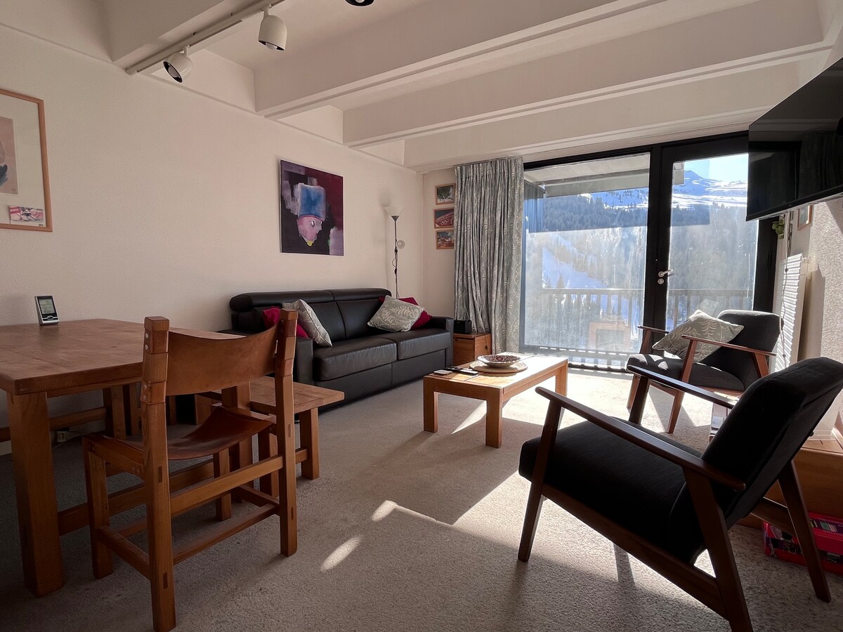 Studio cabine pour 4 personnes,très lumineux, balcon sud avec vue dégagée, Flaine Forum, à 50m des commerces et 150m des pistes. L'appartement se compose d'une entrée / cuisine (lave vaisselle, 2 plaques vitrocéramique, frigo, mini four), une salle de bains (baignoire, WC), une cabine (lits superposés 2 couchages), un séjour (canapé lit double, télévision, lecteur DVD). Balcon avec table et chaises de jardin. Local à skis avec casier privé sécurisé.