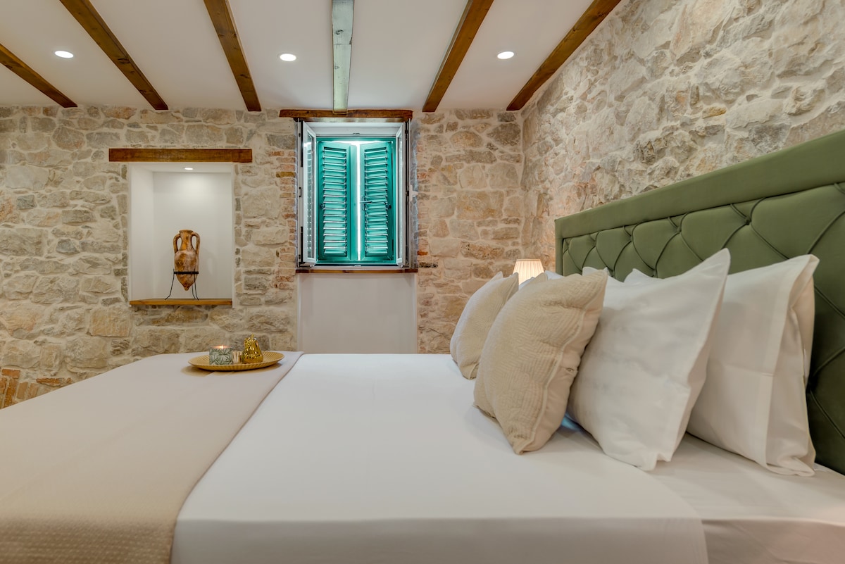 Wake beneath exposed beams of centuries old wooden ceilings. Be charmed by antique touches, industrial style stairs and fine finishes nestled behind sprawling massive internal stone arches of Imperial Palace. Steeped in history drink a glass of wine from the balcony of this unique loft after exploring Split delights, where museum pieces adorn a palette of sand and muted, earthy hues.