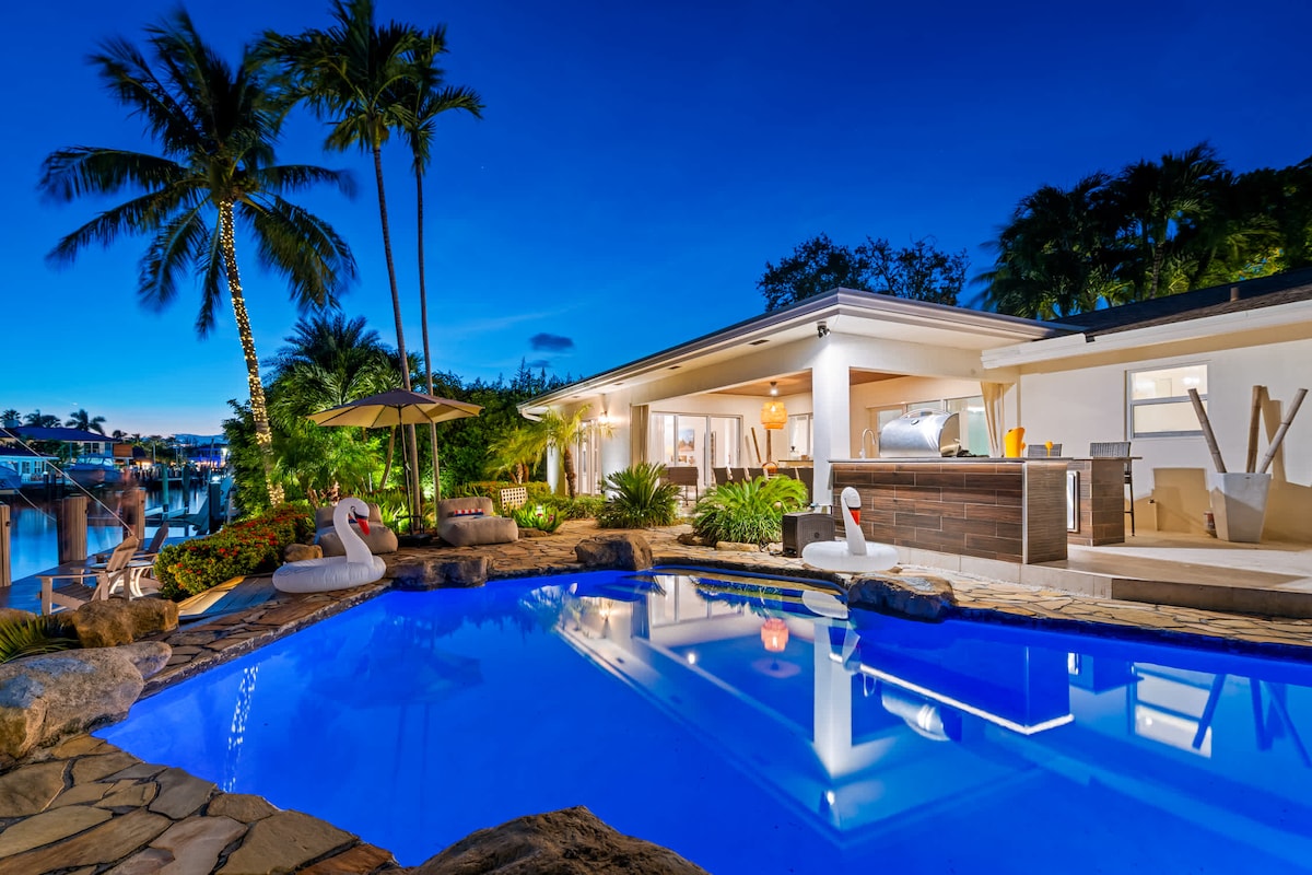 #1 BACHELOR / BACHELORETTE DESTINATION IN FORT LAUDERDALE !!! Also ideal for families:) Tiki Las Olas is a Multi Million dollar luxury Air BNB right on Las Olas Blvd! House (not a townhome) Tiki Bar overlooking a blue lagoon splash pool. Selfie wall with machine. Six foot concrete privacy wall with a secure gate. Polynesian movie theater with high end seating. Custom Tiki twin beds (6) in the theater room. Elevator. Steam Room. Hot Tub