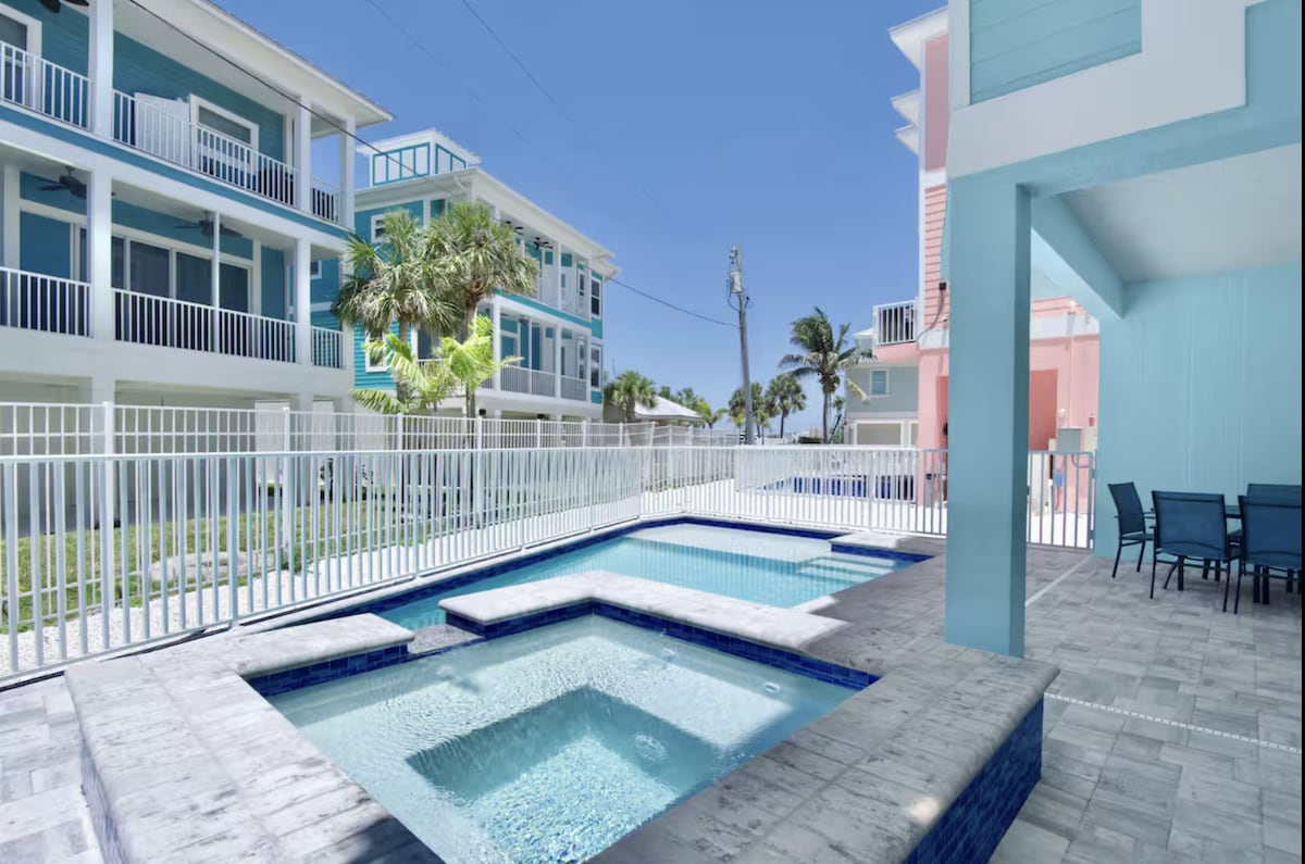 Zabava na obali u kombinaciji sa luksuzom u ovoj trospratnoj kući na plaži u Fort Majersu na ostrvu San Karlos! Ima 4 spavaće sobe, dnevni boravak sa pogledom na zaliv i balkonom, kao i potpuno opremljenu kuhinju i trpezariju na 2. spratu. Uživajte u kuhinji na otvorenom sa roštiljem i barom, kao i u stolu za bilijar, stonu tenis i vazdušni hokej. Privatno pristanište sa dizalicom za čamce i krovna terasa sa travnatom površinom, ležaljkama i hidromasažnom kadom za 6 osoba za uživanje u zalasku sunca. Savršeno za porodice, ljubitelje plovidbe i odmore u grupi.