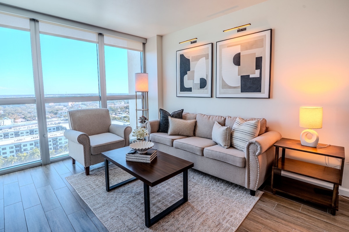 Welcome to Level 19, a modern 19th-floor retreat in Downtown Fort Myers. Enjoy beautiful skyline views, warm décor, and a fully equipped kitchen. Relax in the living area with Queen sofa bed and unwind at the pool, hot tub, or gym. Designed for comfort, this King suite hosts up to four guests. City Views | Pool | Hot Tub | Gym | King Bed | Queen Sofa Bed | Wi-Fi | Smart TV Dining: 2–5 min walk | Edison & Ford 5–10 min | Fort Myers Beach 25–30 min | RSW 25 min