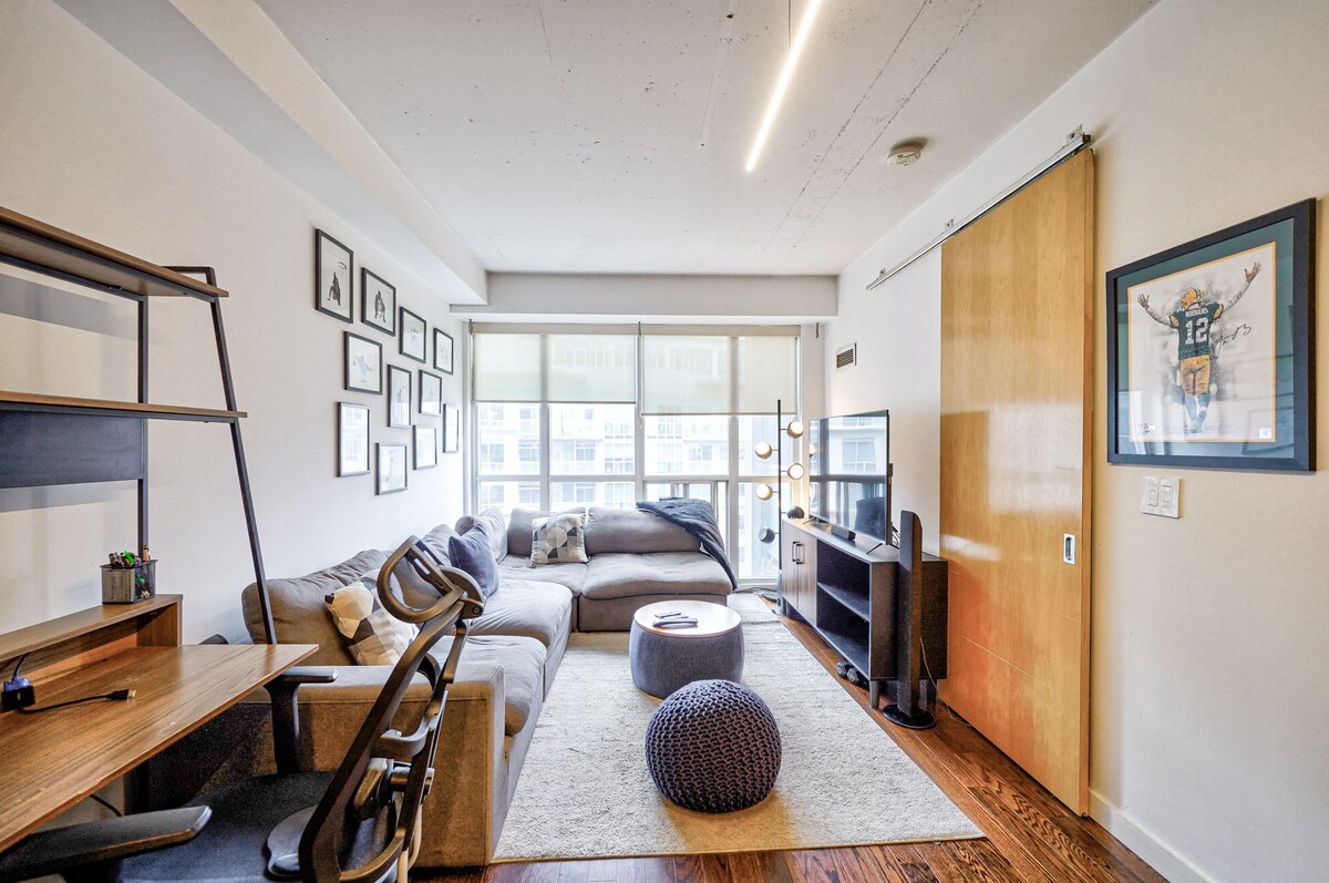 🚨⚽️ Do FIFA-e (BMO Field) se stiže peške! ⚽️🚨 Dobro došli u svoj dom, daleko od doma! Ovaj renovirani jednosobni stan u Fort Jorku kombinuje moderan stil sa udobnošću. Može da primi do 3 gosta sa kaučem na razvlačenje u dnevnoj sobi. Sadrži moderan nameštaj, udoban bračni krevet, privatni balkon, mašinu za pranje/sušenje veša, besplatan parking, 24-časovno obezbeđenje. Na nekoliko koraka od Rodžers centra, amfiteatra RBC, izložbenog centra, aerodroma Bili Bišop i jezera. Vaše savršeno utočište u centru Toronta!