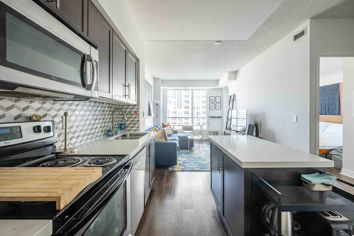 Luksuzan jednosobni stan u centru grada, na nekoliko koraka od arene „Scotiabank“, „Rogers Centra“ i kvarta „Harbourfront“. Idealno za poslovna putovanja, parove i kratke odmore u Torontu. Ovaj moderni stan na obali, smešten u zabavnoj i finansijskoj četvrti Toronta, nudi vam blizinu najpopularnijih atrakcija, saobraćajnih veza, restorana i noćnog života. Uživajte u sadržajima zgrade sa 5 zvezdica, besprekornom, lepo uređenom prostoru i udobnom boravku u stilu hotela. Savršeno za poslovne putnike, parove i turiste koji traže smeštaj u centru Toronta.