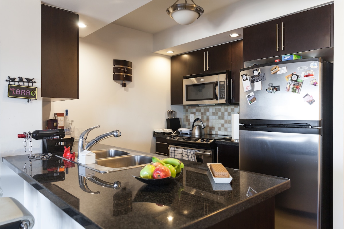 Predivno elegantno i prostrano 2 spavaće sobe, sa 1 bračnim krevetom i 1 bračnim krevetom i 1 besplatnim parking mestom i parkingom za posetioce. Nalazi se u jednom od najboljih područja centra Toronta, samo nekoliko minuta hoda od CN tornja, stadiona Rodžers, arene Scotiabank i obale jezera. Stan je okružen modernim restoranima, prodavnicama i prostorima. U blizini javnog prevoza. Moguće je i preuzimanje i dovoženje. Dodatne nevjerovatne ponude uključene u boravak u odjeljku s ostalim detaljima.