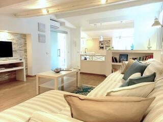 Potpuno renoviran i namješten stan površine 60 m2 krajem maja 2018. godine u morskom stilu. Sastoji se od otvorenog dnevnog boravka, dvokrevetne spavaće sobe i spavaće sobe sa 2 kreveta, kupatila sa tušem sa hromoterapijom, drugog kupatila, velikog balkona i privatne garaže. Smješten u veoma mirnom području i okružen zelenilom, udaljen je 5/10 minuta hoda od mora. Wi-Fi, pametni TV sa Netflix-om, klima-uređaj, mikrotalasna rerna, indukcioni šporet, telefon, bicikli itd.
