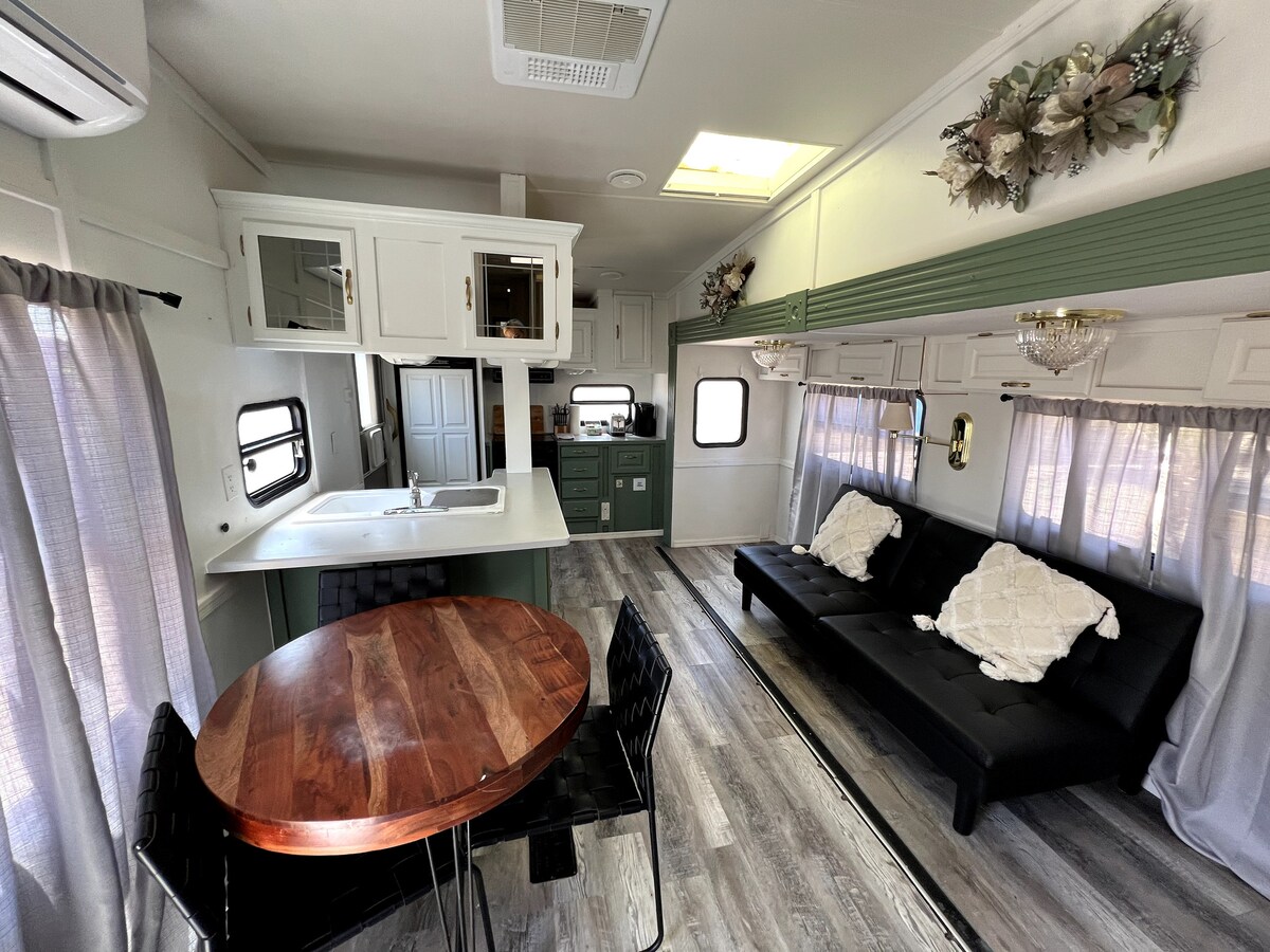 Ovo je stariji peti točak, savršen za one koji traže osnovni, čist i jeftin smještaj. Nije luksuz, ali ima osnovnu opremu: bračni dušek, kauč koji se pretvara u krevet, jednostavnu kuhinju, kupatilo i udoban raspored spavanja za 2 osobe. Dom je rashlađen i grijan pomoću mini split sistema za vašu udobnost. Imajte na umu da je ovo manja kamp prikolica udaljena oko 7 metara.