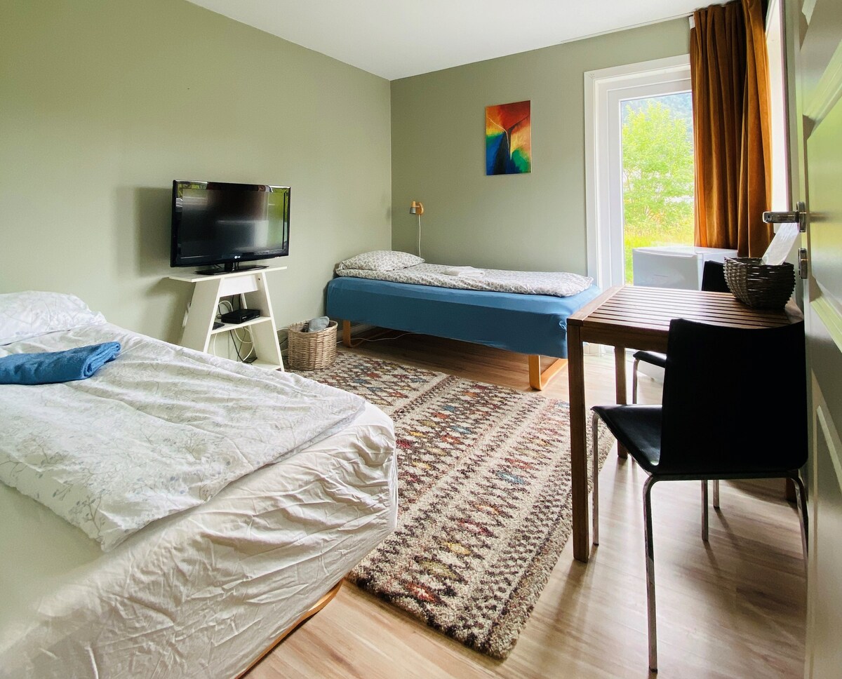 Aneks. Privatna spavaća soba, krevet 120 cm Lepo kupatilo sa tušem, WC-om, umivaonikom i mašinom za pranje veša. Dnevna soba sa kaučem na razvlačenje 150 cm i mini kuhinjom (frižider i 2 rešoa). Blizu mora (50 m) i planina, sa sjajnim pogledom i mogućnostima za planinarenje. 13 km severno od Aure, 33 km južno od Kyrksćterøra.
