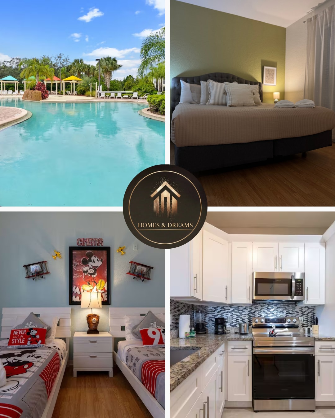 ✨ 7 minuta do Diznija • Za 4 osobe • Bazen, teretana, balkon Moderno odmaralište 1BR, 7 minuta od Diznija. Za 4 osobe s bračnim krevetom + kaučem na razvlačenje. Dostupno pješke do prodavnica i kratkom vožnjom do svih većih parkova. Uživajte u potpuno opremljenoj kuhinji, Wi-Fi mreži, pametnim televizorima, privatnom balkonu sa noćnim vatrometom, bazenu odmarališta, teretani non-stop i praonici veša u jedinici. Savršeno za porodice, parove ili poslovne boravke na daljinu.