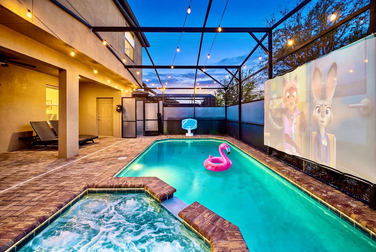 NEW outdoor movie experience for the BEST staycation EVER! It's “Disney Glam”, it's mid-century modern, & get this: EVERY bedroom has a Magic Kingdom theme (even adult rooms!) because that’s what the Disney spirit is all about! After a fun day at WDW (6 mi. away) or Universal Studios (17 mi.), unwind in our Jacuzzi with fun string lights above! Not going to the parks? Relax in our heated pool, cook out on our grill & enjoy DISNEY+ on our 55in SmartTV (all free of charge)! We offer TWO work spaces for all your virtual work and school needs and we just installed a NEW TP-Link Deco Mesh WiFi System(Deco M3) – Up to 4,500 sq.ft Whole Home Coverage in 20201! We also have a NEW AC unit in our garage game room for all year round enjoyment! Plus our gated community has a gym, tennis, volleyball, playgrounds, & a Tiki bar!
