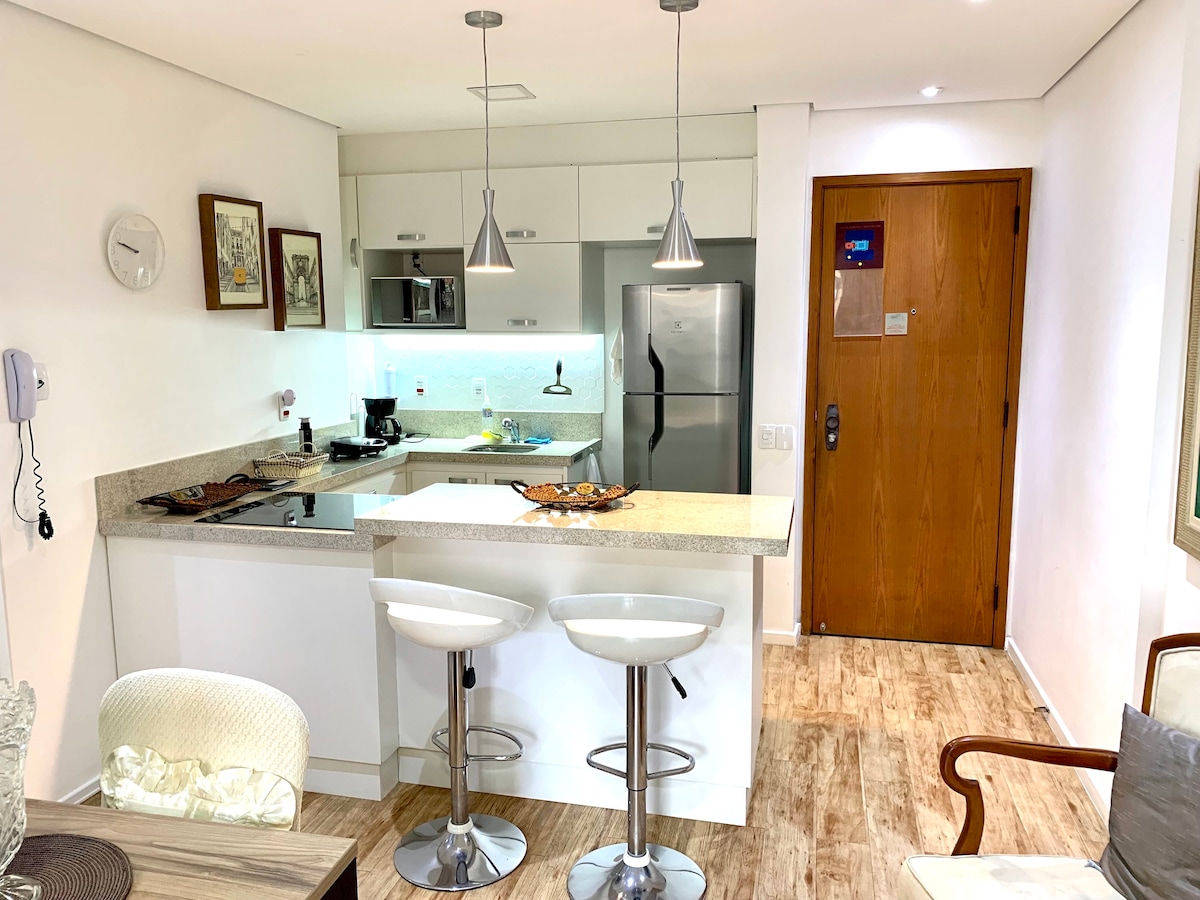 Uživajte u elegantnom doživljaju u ovom dobro smještenom smještaju. Šarmantan, lijepo uređen i udoban studio sa garažnim prostorom u zgradi sa bazenom na krovu. Gradska vijećnica, vešeraj, biblioteka igračaka, teretana i prodavnica Pão de Açúcar Minuto (mini-market) u prizemlju. Sa opcijom zatvaranja/otvaranja balkonskog stakla u vazduhu doma uz bezbjednost kondominijuma. Mnogi ormarići i kućni pribor gostima pružaju osjećaj kao da je kod kuće. Wi-Fi VIVA VLAKNA OD 600 Mb/s.