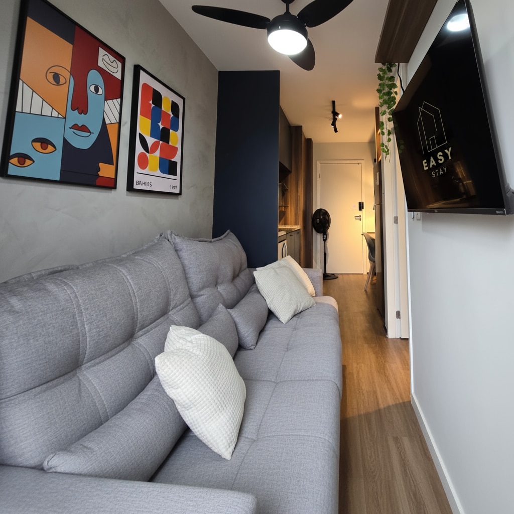 Experience One Eleven in Vila Olimpia. This modern apartment features large windows with breathtaking city views and natural light. The unit boasts 600 Mbps internet and a 4K HD TV. For total comfort, it has a Hot/Cold AC system: 27,000 BTU/h unit in the living room and 10,000 BTU/h in the bedroom. The bedroom is quiet and dark for a restful sleep. Impeccably maintained, you’ll be walking distance to top restaurants and business hubs—a safe, upscale retreat with a stunning urban backdrop.