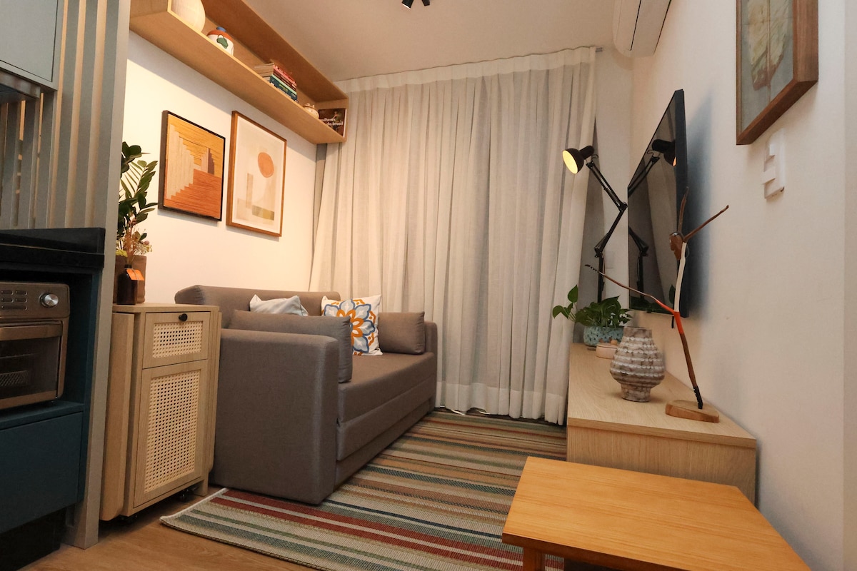 Opustite se u ovom mirnom i elegantnom prostoru. Aconchegante studio nalazi se na jednom od najživopisnijih mjesta u Sao Paulu, između četvrti Jardins i Vila Madalena. Sa 40 m2, nudi savršenu ravnotežu između udobnosti i praktičnosti. Uživajte u blizini metroa, bioskopa, usp, muzeja, vreve barova, restorana i prodavnica u regionu. Sadržaji u garsonjeri: - 40 m2 privatnog prostora - Opremljena kuhinja - Privatno kupatilo - 1Cama Queen - 1 futon kauč na razvlačenje