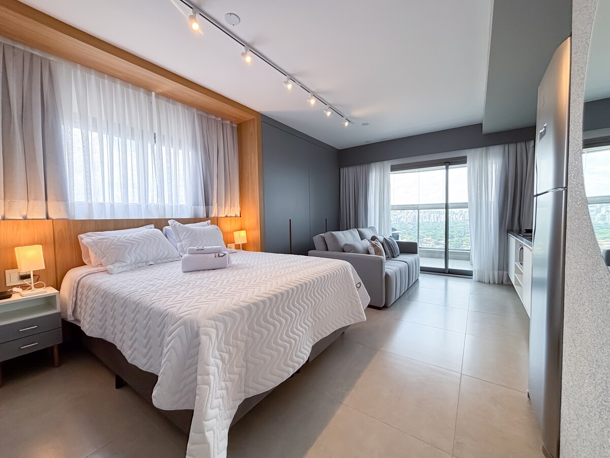 Butik studio sa jednim od najlepših pogleda na grad Sao Paulo. Nalazi se 2 minuta hoda od metroa. Potpuno opremljena kuhinja sa frižiderom skrivenom drvenim vratima. Wi-Fi, klima i pametni TV od 55 inča. Samostalna prijava sa pametnim elektronskim zaključavanjem. Igrajte tenis ili idite u teretanu i opustite se u bazenima (na otvorenom ili u zatvorenom prostoru) i saunama (mokrim ili suvim) nakon toga. Zajednički prostor takođe uključuje prostorije za saradnju i vešernicu. Posjetioci moraju biti prethodno registrovani na prednjem odredištu.