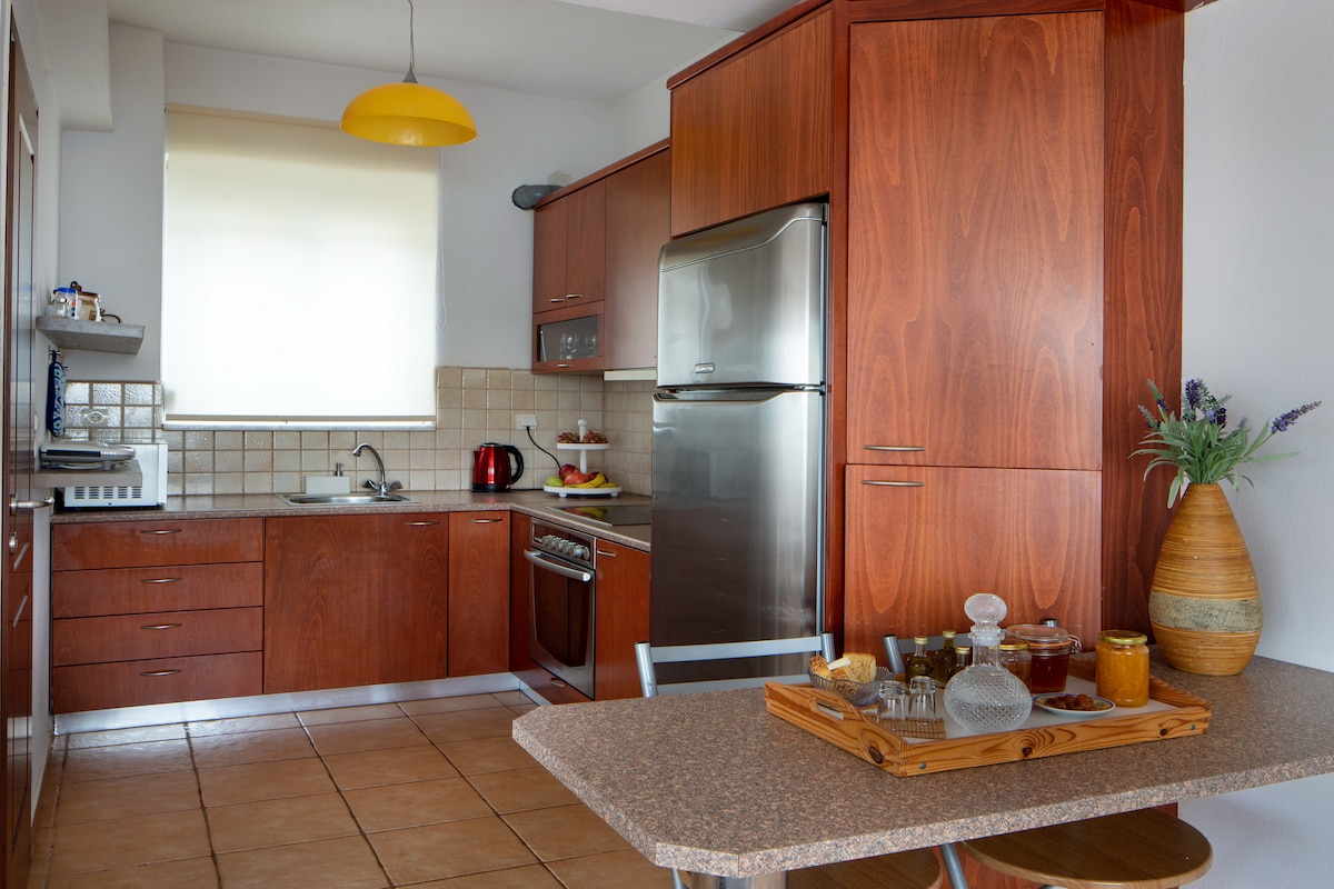 To je stan površine 85 kvadratnih metara sa izvanrednim pogledom i morden dizajnom u okruženju gde je jedina buka šumske ptice. Obaveštavamo vas da naš stan NEMA KLIMA-UREĐAJE i neefikasne uređaje. Parkiralište je udaljeno 10 metara. Za 15 minuta hoda nalazite se u supermarketu Lidl, a na 300 metara udaljenosti nalazi se i mini pijaca. Takođe, poznati kafić Koukouvaya nalazi se na 10 minuta pešice.