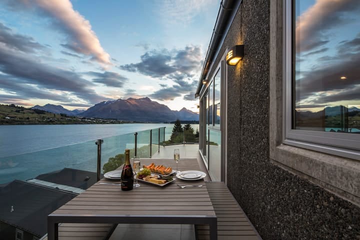 Zapanjujući pogled na zaliv Kvinstaun, jezero i gondolu Skyline, koja se koristi za kalendar Novog Zelanda! Samo 5-8 minuta hoda do CBD-a. Ovo prostrano utočište ima jedno praktično besplatno parking mjesto u sklopu objekta. Potpuno moderna kuhinja, hidromasažna kada, kancelarija i zimski vrt, vešernica, mašina za sušenje veša unutra. Svaka spavaća soba ima prostor za šminkanje i fen za kosu. Udobno se smjestite uz klima-uređaj, toplotnu pumpu, električne ćebad i požar na gas. Uživajte u privatnosti, zalascima sunca koji oduzimaju dah i nenadmašnom pejzažu iz ovog savršeno smještenog smještaja!