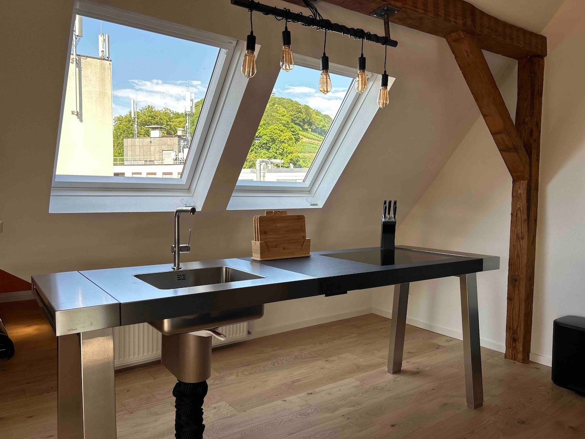 Prelep, vijugav i s ljubavlju namješten stan u potkrovlju u okrugu Wiehre u Frajburgu u navedenoj i potpuno renoviranoj vili Gründerzeit. Doručkujete na prostranoj krovnoj terasi s pogledom na katedralu Freiburg i Crnu šumu. Spavaće sobe su neobične zabate i kupole, a zbog kosih plafona NE MOGU se zaključati vratima.