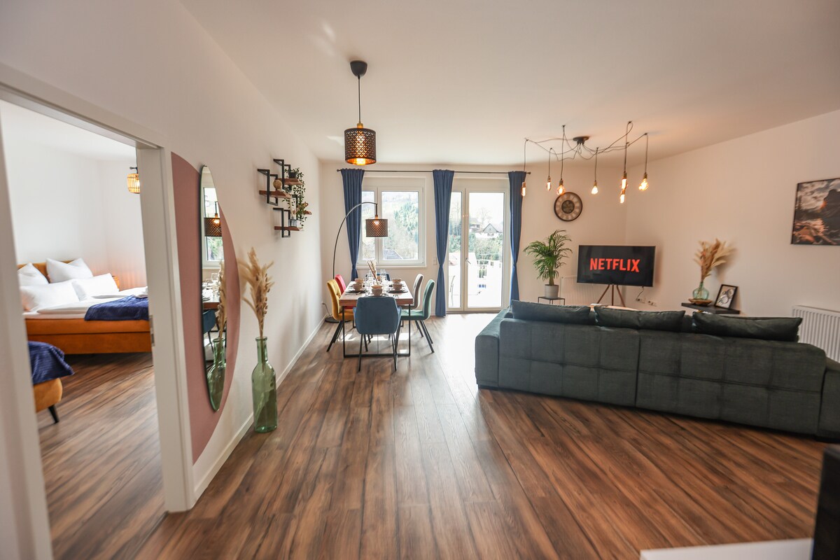 Lehne dich zurück und entspanne dich – in dieser ruhigen & stilvollen Unterkunft. Im März 2023 wurde die ehemalige Grundschule komplett saniert und um 1 Stockwerk erhöht. In diesem befindet sich diese wunderschöne Penthouse Wohnung im 2. OG. Die Wohnung hat 1 Schlafzimmer mit 2 Boxspring-Betten (180x200cm), 1 Badezimmer mit WC sowie einen großen Wohn-Ess-Bereich mit einer hochwertigen Küche. Nespresso Kaffee und Tee inklusive. Vom Balkon hat man einen tollen Blick. Urlaubsgefühl pur.