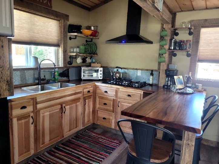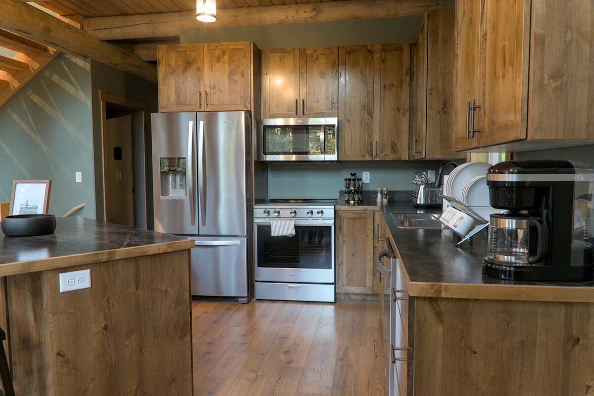 Waterfront at beautiful Henrys Lake, the Crooked Pine includes a private deck to enjoy morning coffee or an evening glass of wine. With epic views, this unique gem features a private bedroom, full bathroom and kitchen, with a comfortable living area and large smart TV. Ideal for couples with 1–2 small children. Included is a ramp for easy access, 36" doorways and walk-in shower with grab bars. A perfect base for exploring Yellowstone and Grand Teton, then relaxing after a full day of adventures.