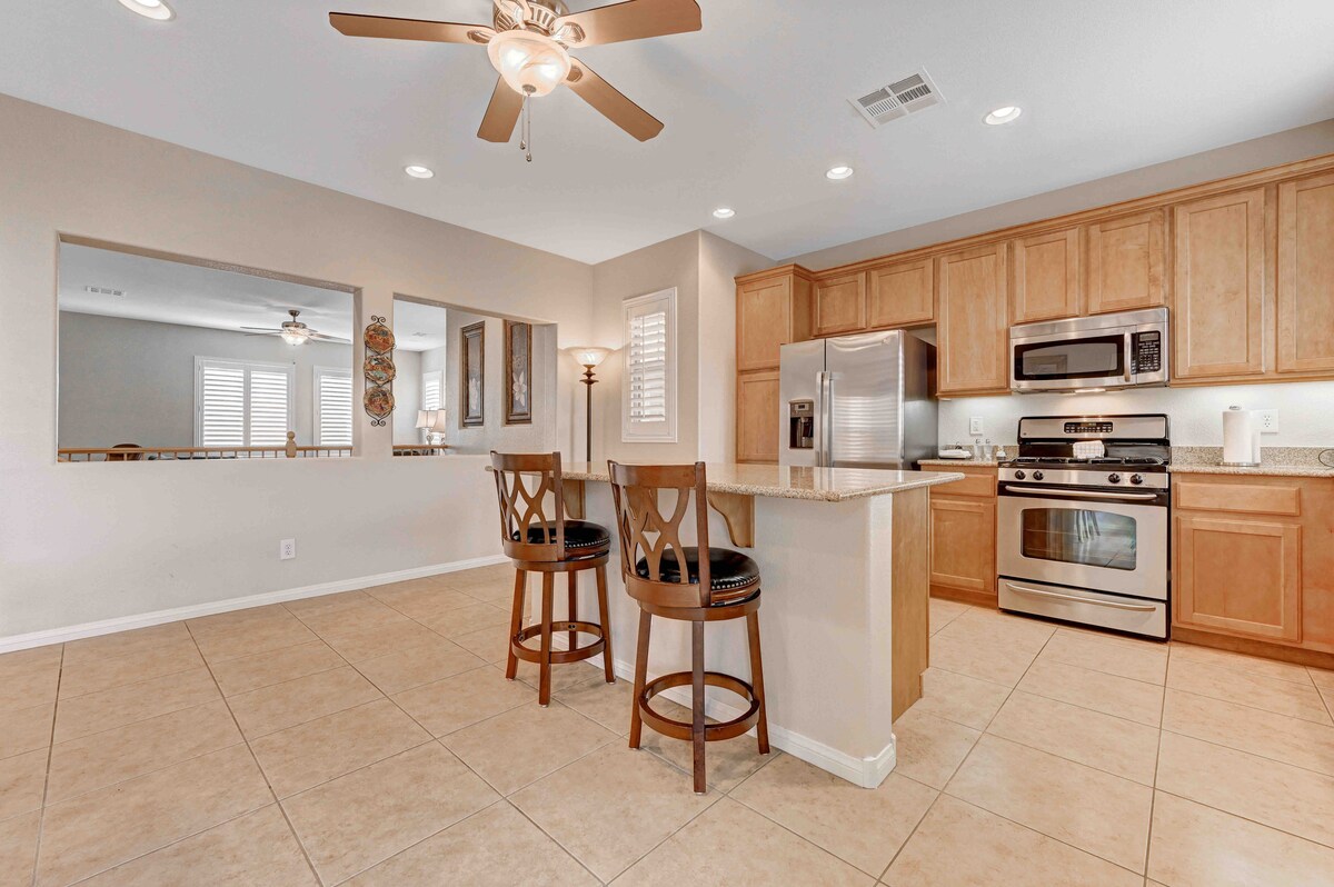 Čist, prostran i privatni dom sa 4 spavaće sobe, dizajniran za opuštanje nakon napornih dana u Vegasu ili dugog putovanja. Otvoren raspored, udobni prostori za sedenje i najprijatnije temperature u celoj kući omogućavaju grupama da borave zajedno bez osećaja gužve. • 4 spavaće sobe (bračni kreveti (širine 150–179 cm)) • 2 kupatila • 2 kauča na razvlačenje za dodatne goste • Potpuno opremljena kuhinja • bluetooth zvučnik • Brzi Wi-Fi – 602 Mbps + pametni televizor • Potpuno nova klima-uređaj + pomoćna jedinica + plafonski ventilatori u svakoj sobi