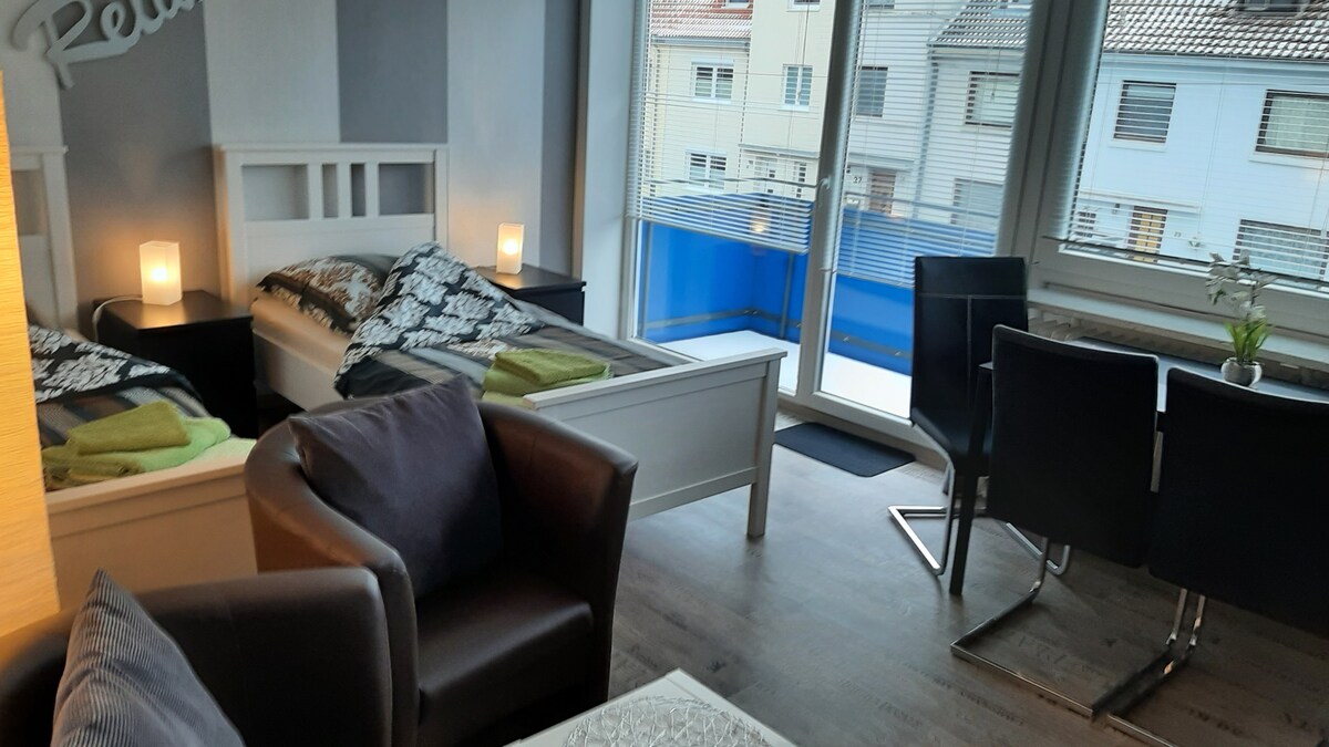 Četvorosoban stan na mirnoj lokaciji sa balkonom za ekskluzivnu upotrebu. Oko 15-20 minuta hoda od glavne željezničke stanice i AWD kupole. Javna parking mesta oko kuće. 5 minuta hoda do parka Bürgerpark sa aktivnostima u slobodno vrijeme, restoranima, jezerom za plivanje. Kupovina u blizini. Postoje dve spavaće sobe (1x bračni krevet 1,80 x 2,00 m, 1x 1,40 x 2,00 m)