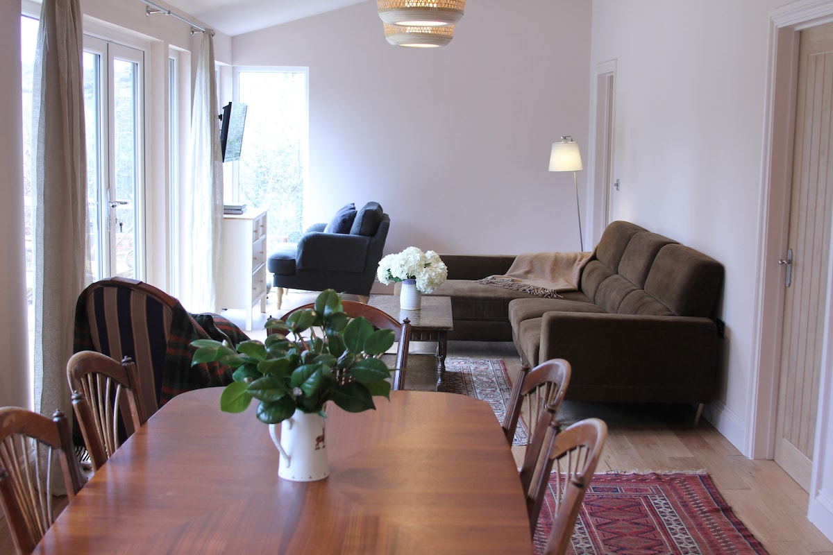 Veliki studio apartman na predivnoj maloj lokaciji okružen šumom. Privatna terasa sa lepim pogledom i direktnim pristupom šumi. Nedavno je renovirana i ima plinski gorionik (začinjeno drvo), Indukcionu ploču, rernu, mašinu za pranje veša, frižider i zamrzivač. Dovoljno parkinga i skrivenog prostora za odlaganje bicikala itd. Gledajte jelena sa prozora! Najbliži pab je udaljen 10 minuta hoda, a ima još 3 pabova u krugu od 3 milje, uključujući Rojal Ouk u Fritamu.